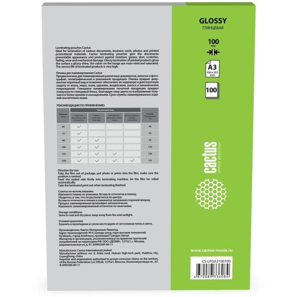 Пленка для ламинирования Cactus 100мкм A3 (100шт) глянцевая 426x303мм CS-LPGA3100100