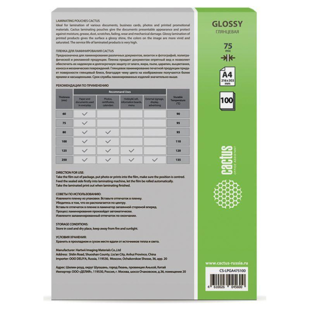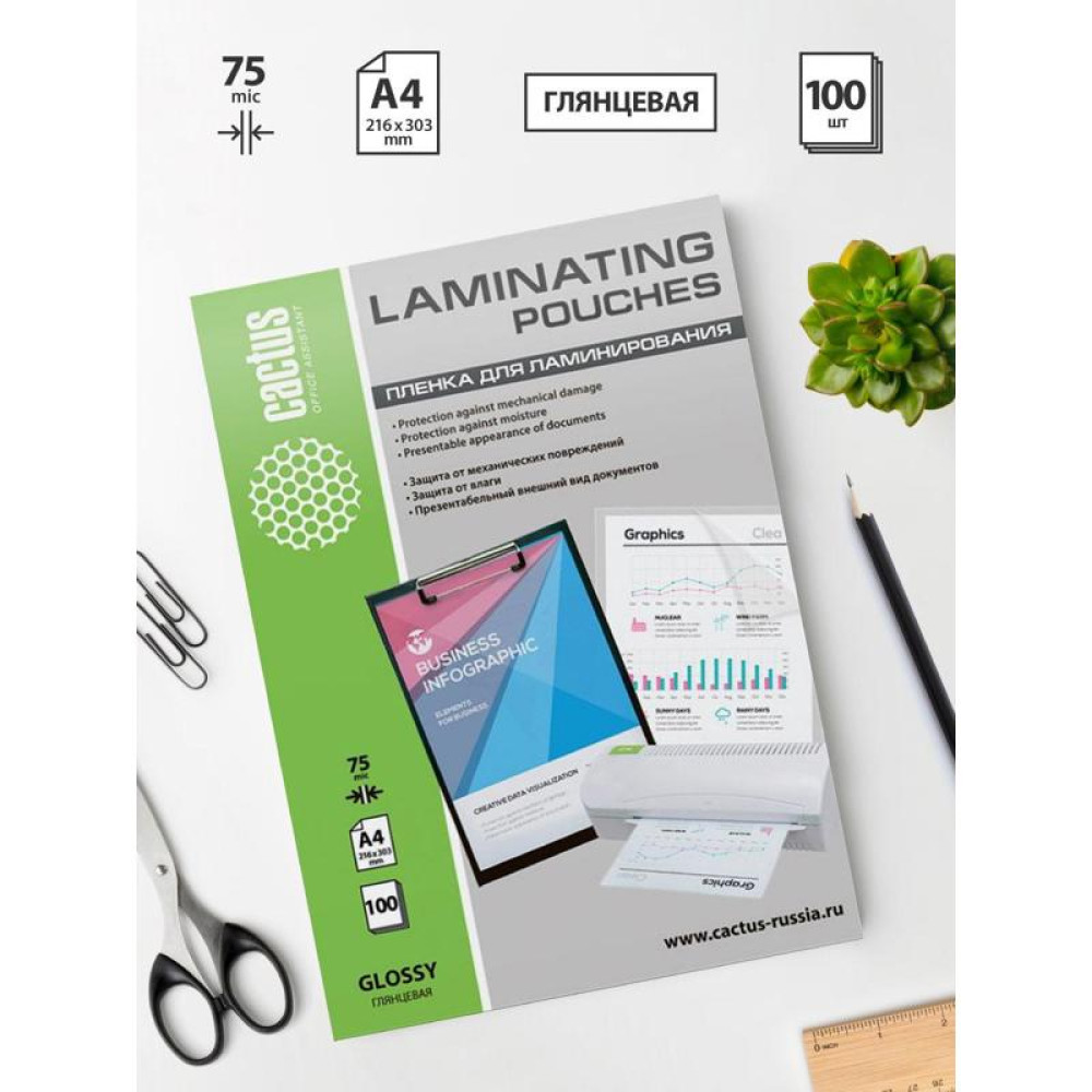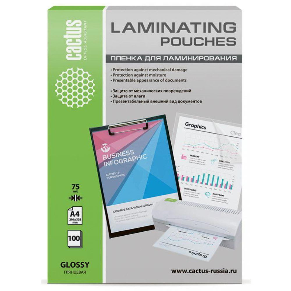 Пленка для ламинирования Cactus 75мкм A4 (100шт) глянцевая 216x303мм CS-LPGA475100