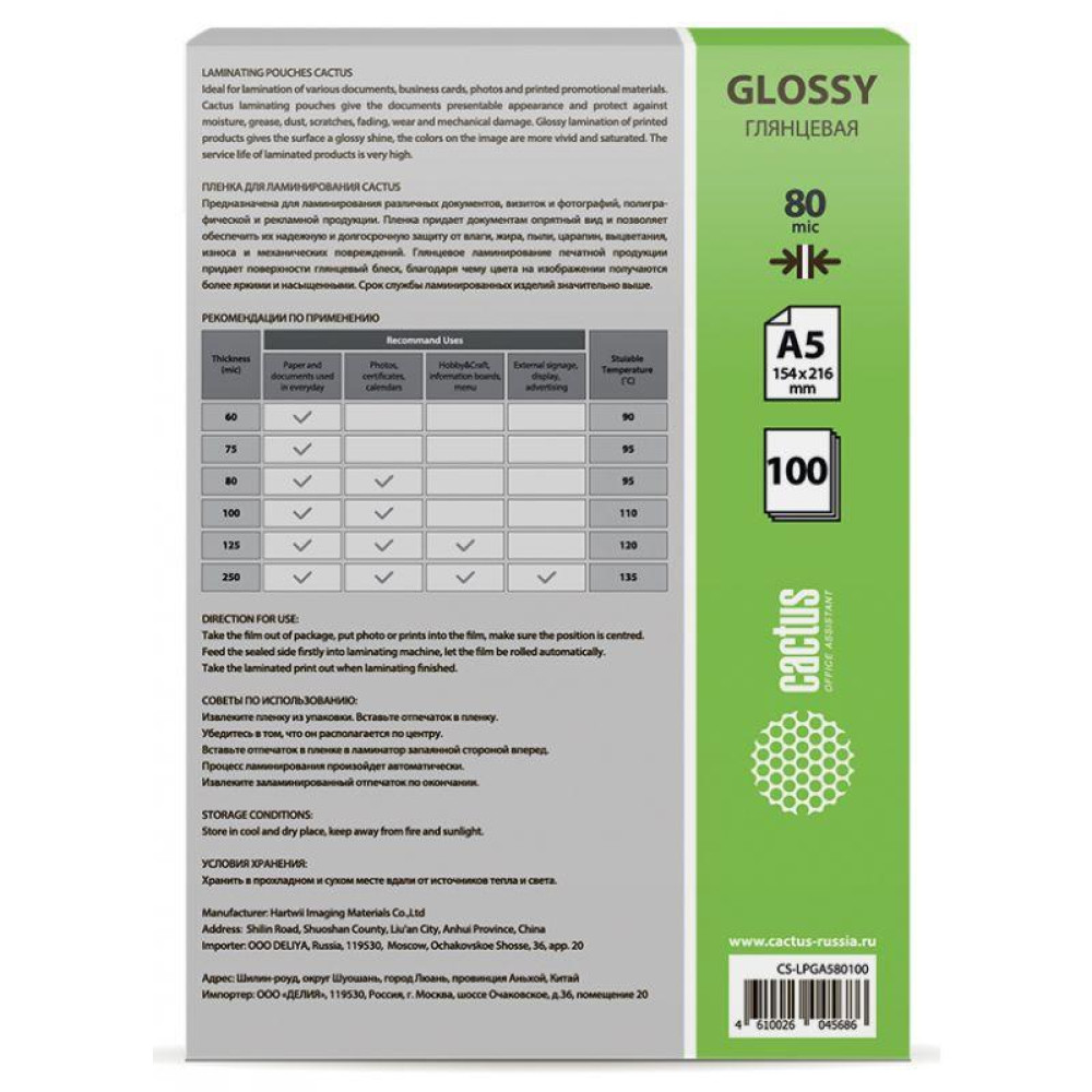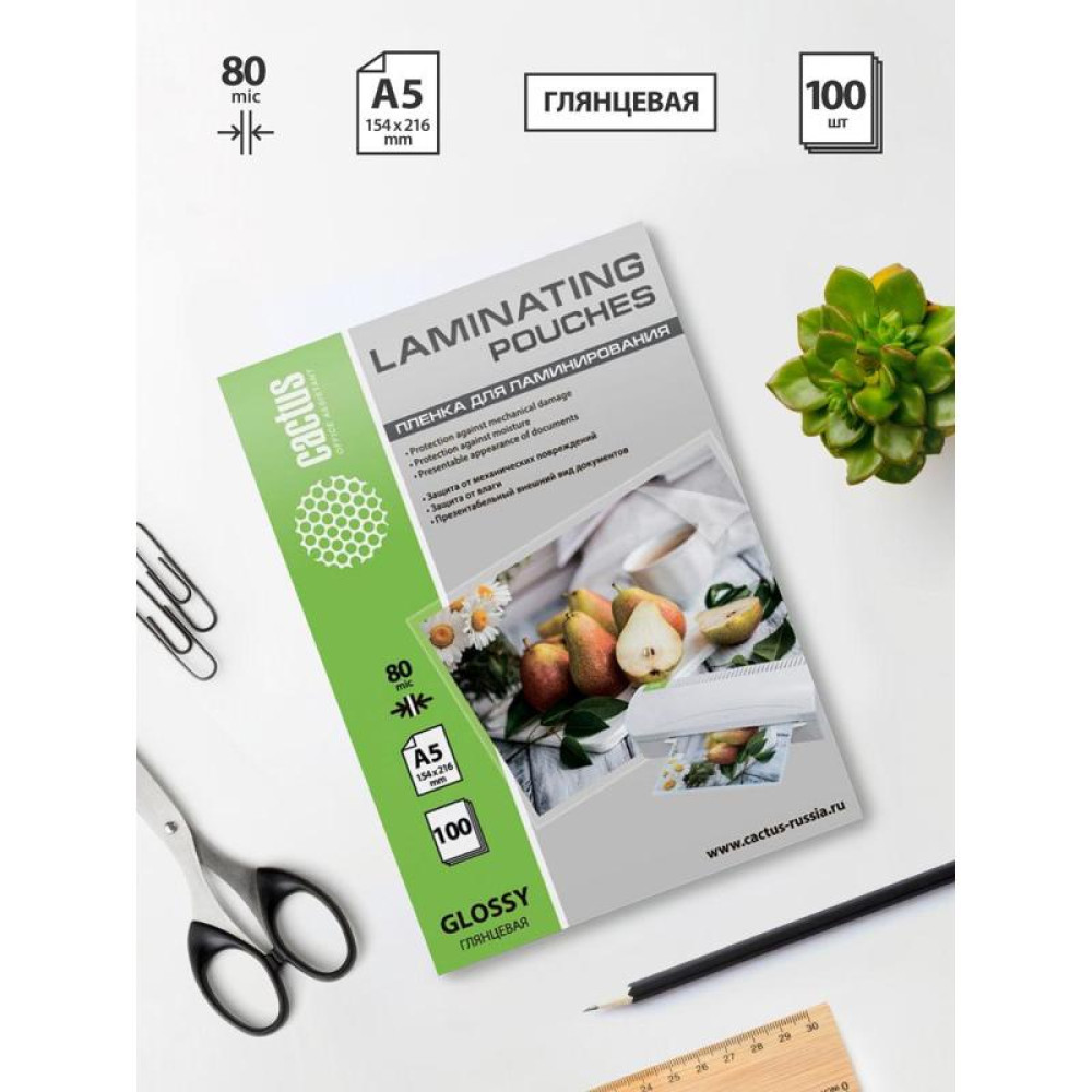 Пленка для ламинирования Cactus 80мкм A5 (100шт) глянцевая 154x216мм CS-LPGA580100