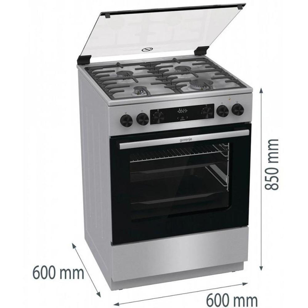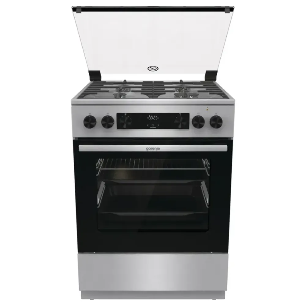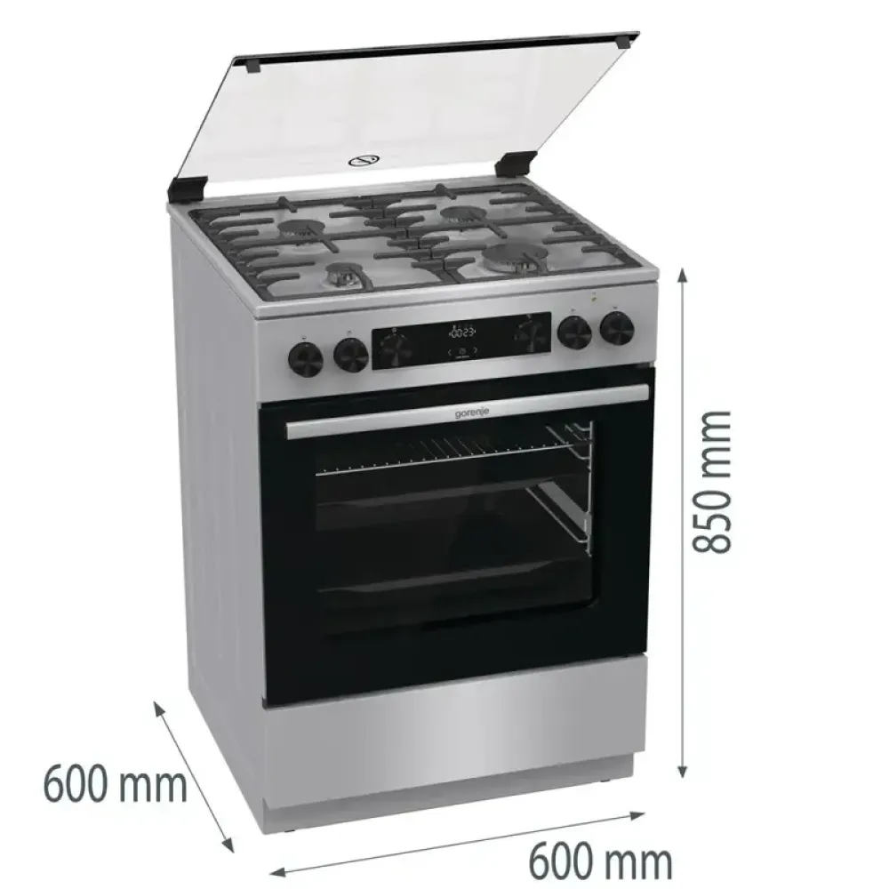 Комбинированная плита GKS6C72XF. Сенсорный программатор IconLED. 60 × 85 × 60 см. Сводчатая форма HomeMade. Духовки OptiBake в плитах Gorenje известны своей инновационной формой внутренней камеры, которая стала их визитной карточкой. Сводчатая форма HomeMade создана по подобию традиционной дровяной печи и обеспечивает более эффективную циркуляцию воздуха по сравнению с другими продуктами на рынке. Теперь мы обновили форму HomeMade, и циркуляция воздуха дополнительно улучшилась благодаря новой конструкции нагревательных элементов и новому расположению отверстий подачи воздуха. Это обеспечивает одинаковую температуру по всему пространству духовки. Ваши блюда больше не будут подгоревшими с одной стороны и недоготовленными — с другой. FrozenBake. Быстрое приготовление замороженных продуктов. Эта эффективная программа идеально подходит для приготовления любых замороженных продуктов и полуфабрикатов. BigSpace: просторная духовка. Готовите блюда внушительных размеров? Благодаря инновационной конструкции духовка стала больше и шире. На противнях теперь помещается больше продуктов, а современные технологии обеспечивают равномерное приготовление на всех уровнях. Очистка паром AquaClean. Функция AquaClean — ощутимая помощь в очистке рабочей камеры. Все, что требуется, — это налить 0,5 литра воды в противень и включить функцию AquaClean. Через 30 минут результаты видны на внутренних стенках духовки и противнях. Загрязнения и жир размягчаются, и их остается просто протереть. Качество и тип эмали крайне важны для качества духовки и ее работы. SilverMatte — суперстойкий и высокопрочный материал, способный выдерживать очень высокую температуру. Гладкой, непористой эмалью покрыты внутренние поверхности духовки и противни, что делает их устойчивыми к высокой температуре. Тройное покрытие внутренних поверхностей отражает высокую температуру и обеспечивает дополнительную изоляцию. Активное покрытие позволяет поддерживать чистоту и безопасную среду в духовке.