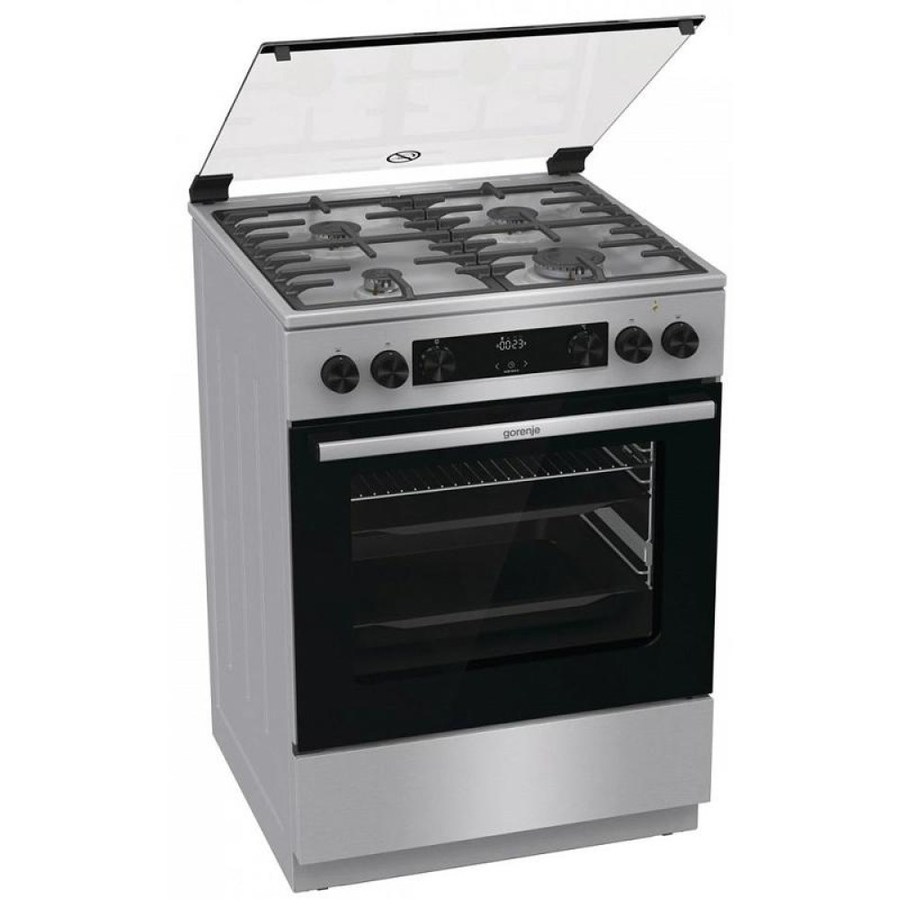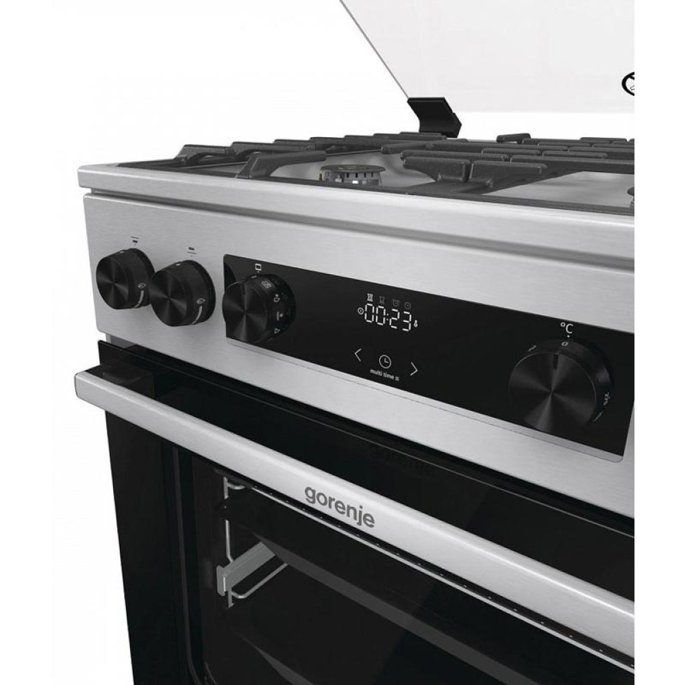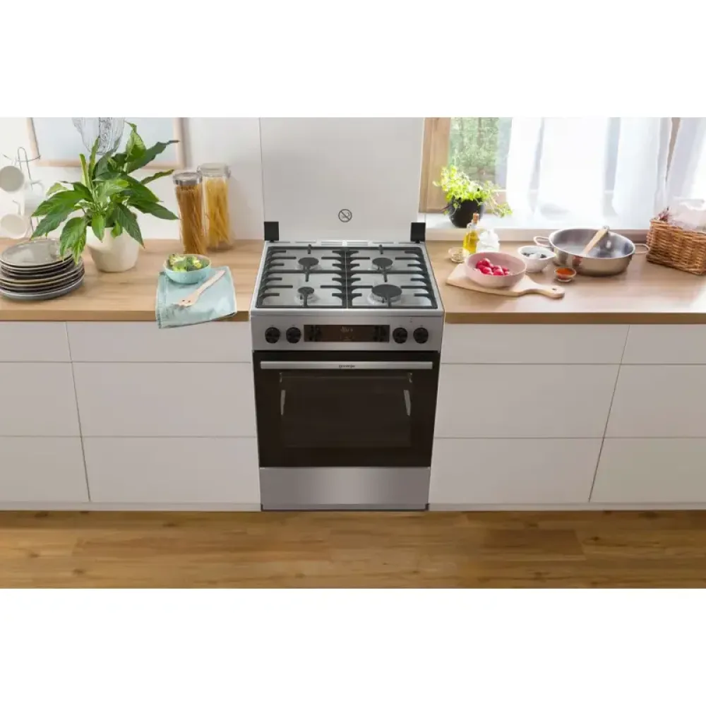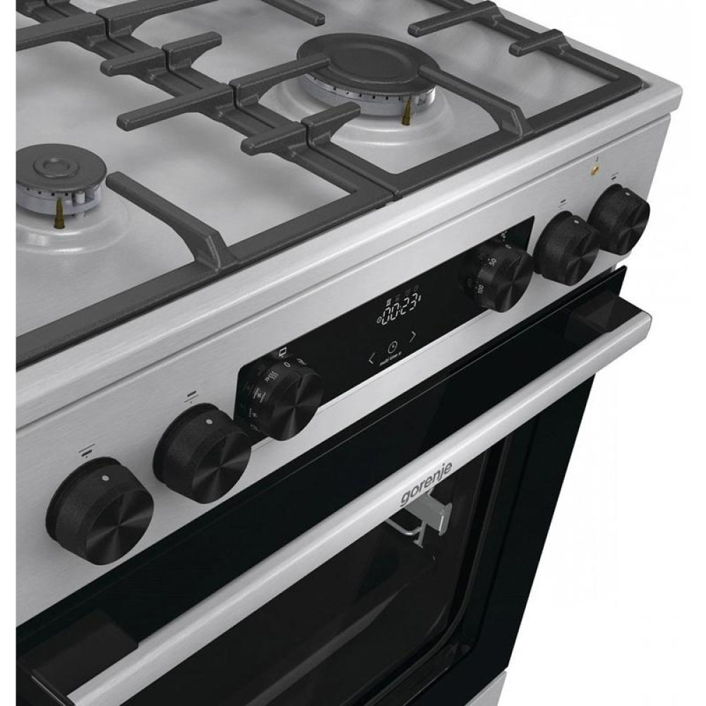 Комбинированная плита GKS6C72XF. Сенсорный программатор IconLED. 60 × 85 × 60 см. Сводчатая форма HomeMade. Духовки OptiBake в плитах Gorenje известны своей инновационной формой внутренней камеры, которая стала их визитной карточкой. Сводчатая форма HomeMade создана по подобию традиционной дровяной печи и обеспечивает более эффективную циркуляцию воздуха по сравнению с другими продуктами на рынке. Теперь мы обновили форму HomeMade, и циркуляция воздуха дополнительно улучшилась благодаря новой конструкции нагревательных элементов и новому расположению отверстий подачи воздуха. Это обеспечивает одинаковую температуру по всему пространству духовки. Ваши блюда больше не будут подгоревшими с одной стороны и недоготовленными — с другой. FrozenBake. Быстрое приготовление замороженных продуктов. Эта эффективная программа идеально подходит для приготовления любых замороженных продуктов и полуфабрикатов. BigSpace: просторная духовка. Готовите блюда внушительных размеров? Благодаря инновационной конструкции духовка стала больше и шире. На противнях теперь помещается больше продуктов, а современные технологии обеспечивают равномерное приготовление на всех уровнях. Очистка паром AquaClean. Функция AquaClean — ощутимая помощь в очистке рабочей камеры. Все, что требуется, — это налить 0,5 литра воды в противень и включить функцию AquaClean. Через 30 минут результаты видны на внутренних стенках духовки и противнях. Загрязнения и жир размягчаются, и их остается просто протереть. Качество и тип эмали крайне важны для качества духовки и ее работы. SilverMatte — суперстойкий и высокопрочный материал, способный выдерживать очень высокую температуру. Гладкой, непористой эмалью покрыты внутренние поверхности духовки и противни, что делает их устойчивыми к высокой температуре. Тройное покрытие внутренних поверхностей отражает высокую температуру и обеспечивает дополнительную изоляцию. Активное покрытие позволяет поддерживать чистоту и безопасную среду в духовке.