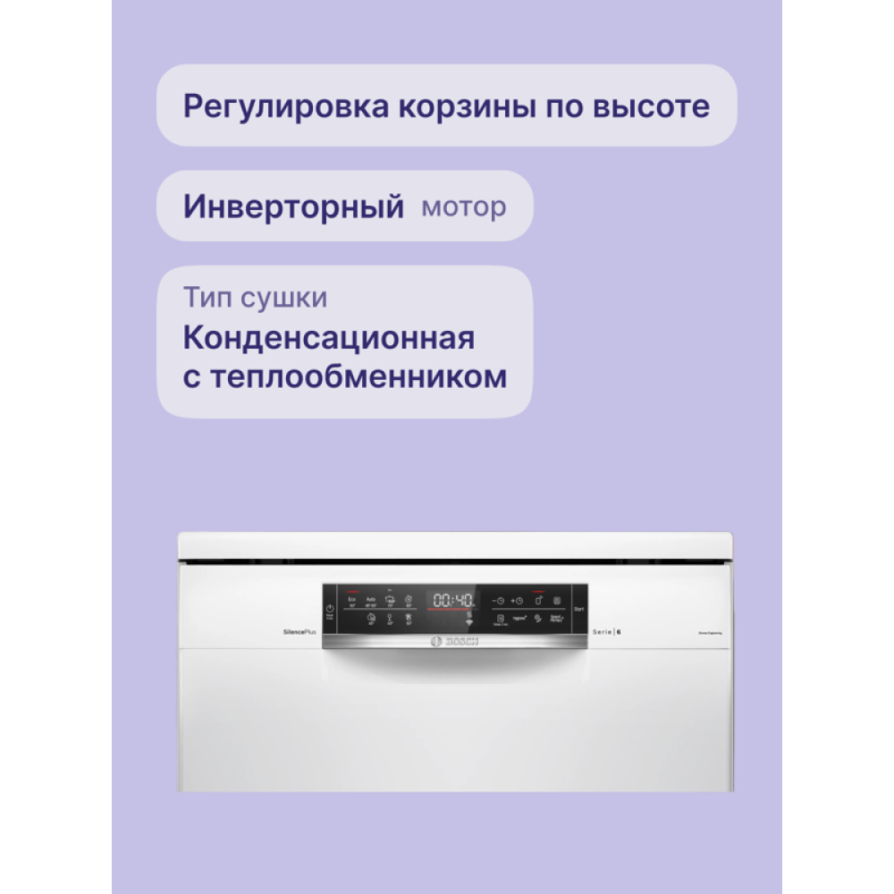 Посудомоечная машина Bosch SMS6EMW65Q с инверторным двигателем EcoSilence Drive, эта посудомоечная машина работает очень тихо, что делает ее идеальным выбором для тех, кто ценит спокойствие и тишину в доме. Также она оснащена функцией HygienePlus, которая гарантирует гигиеничную чистоту посуды, уничтожая до 99,9% бактерий и микробов.