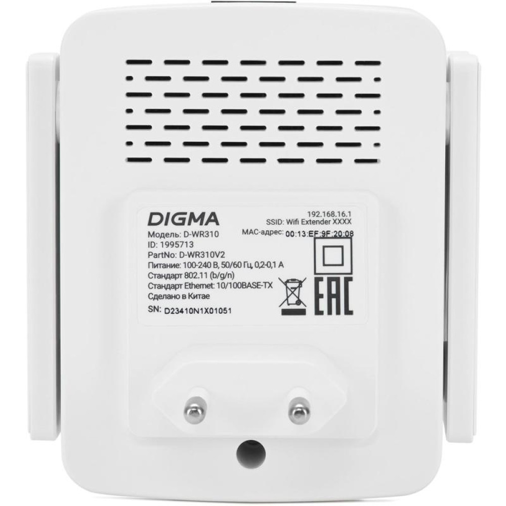 Повторитель беспроводного сигнала Digma D-WR310 (D-WR310V2) N300 Wi-Fi белый