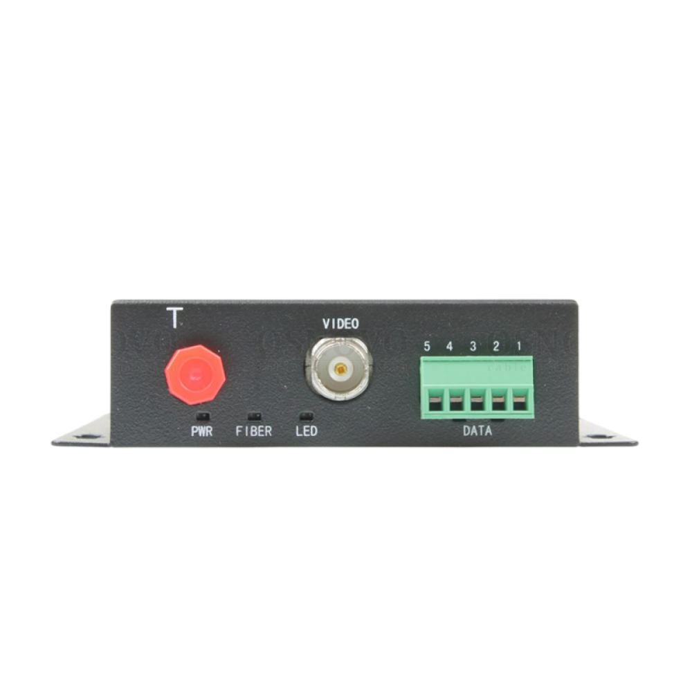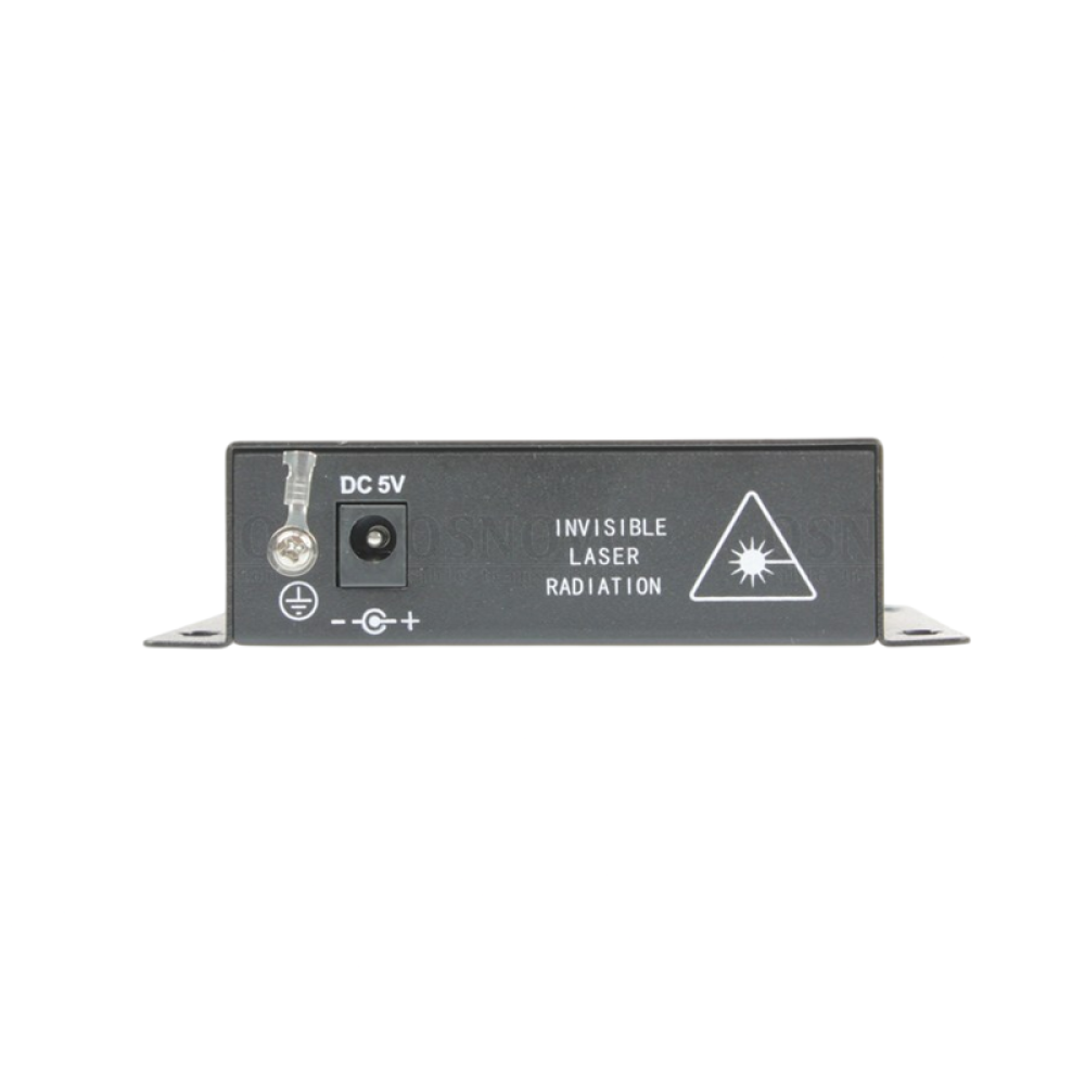 На входе — BNC-разъём для видеосигнала, разъём питания 5.5 мм (DC 5V) и клеммная колодка для RS485. На выходе — оптический разъём FC, обеспечивающий надёжное соединение с приёмником.