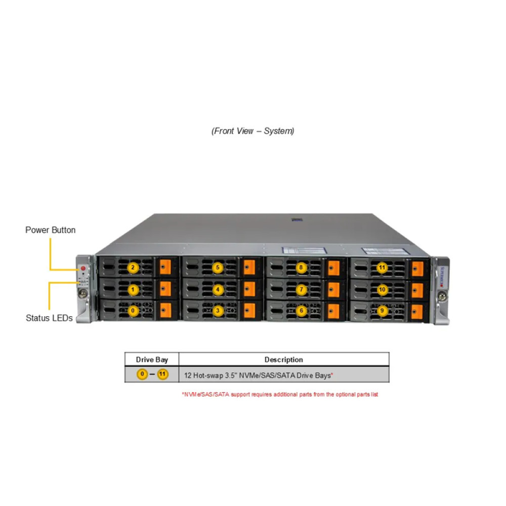 Одним из ключевых преимуществ модели является поддержка до 12 горячезаменяемых накопителей формата 3.5" или 2.5". Эти слоты универсальны и могут работать с накопителями NVMe, SATA или SAS, предоставляя администраторам полную свободу в выборе типа, скорости и стоимости хранилища. Дополнительно два слота M.2 PCIe 3.0 NVMe идеально подходят для установки операционной системы или кэширующих накопителей, повышая общую отзывчивость системы.