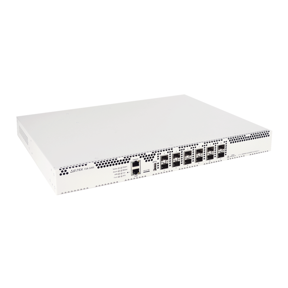 Сервисный маршрутизатор ESR-3200, 12хEthernet 1000BASE-X/10GBASE-R/25GBASE-R, 16, 32 или 48 ГБ RAM, 1 слот для SD-карт, 2 слота для модулей питания