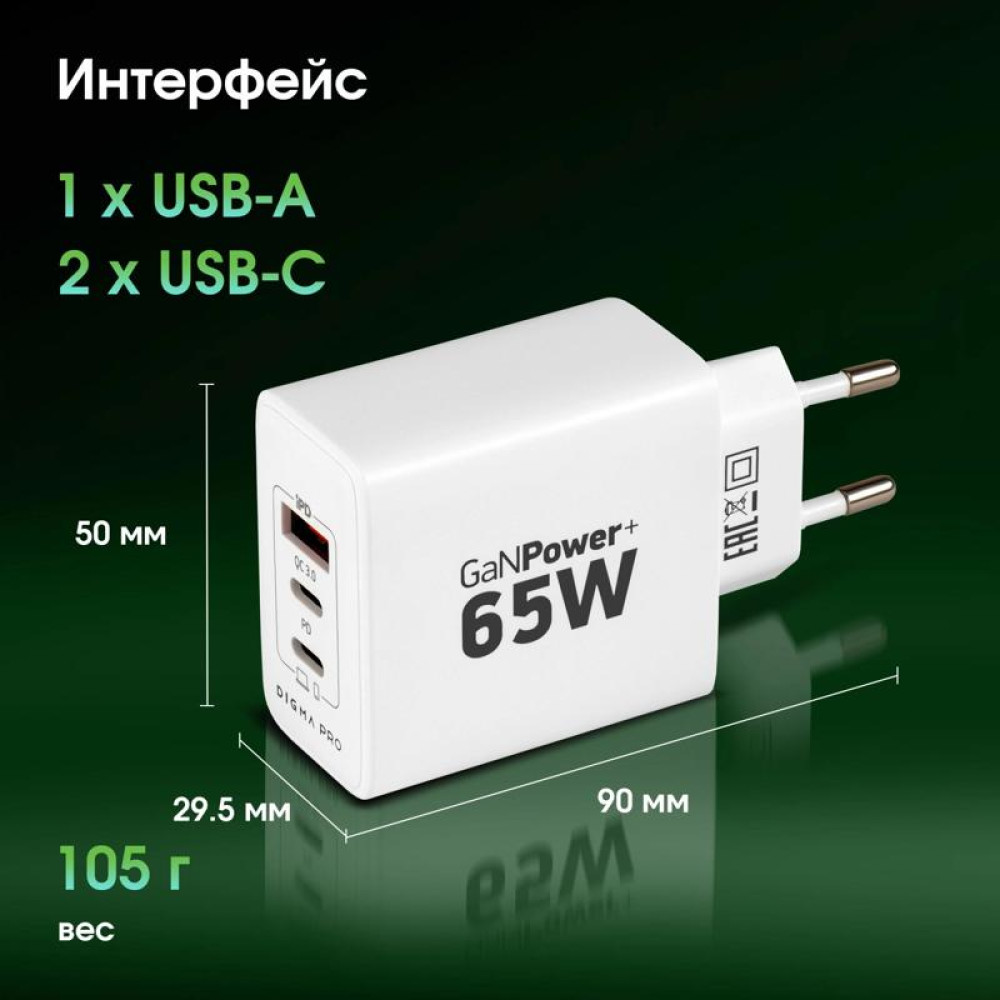 Сетевое зар./устр. Digma Pro DPW6B 65W 3.25A (PD+QC) 2хUSB-C/USB-A универсальное белый (DPW6B5GX12WH)