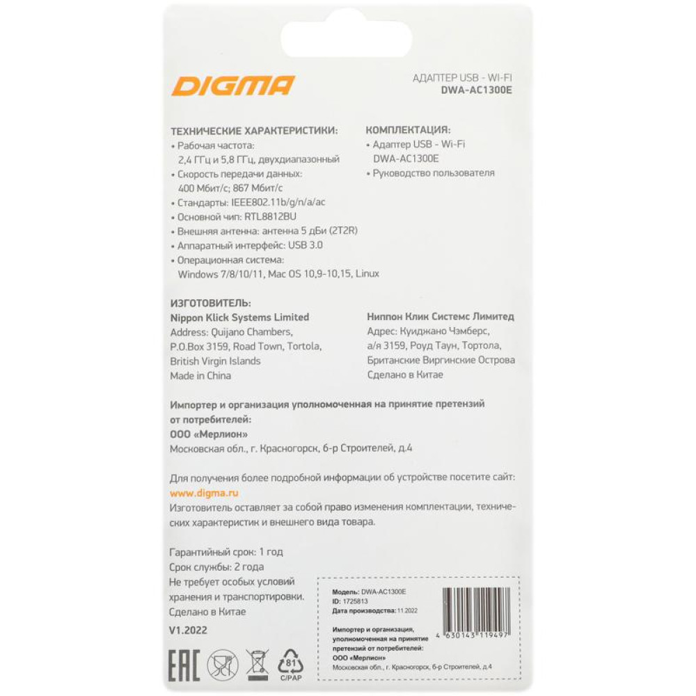 Сетевой адаптер Wi-Fi Digma DWA-AC1300E AC1300 USB 3.0 (ант.внеш.съем) 1ант.