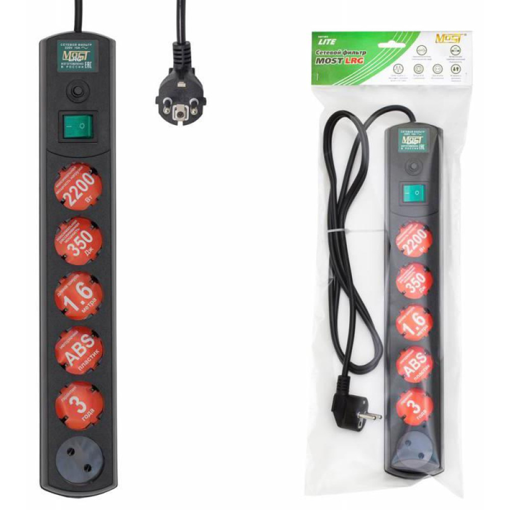 Сетевой фильтр Most LRG 3м (6 розеток) черный (пакет ПЭ)