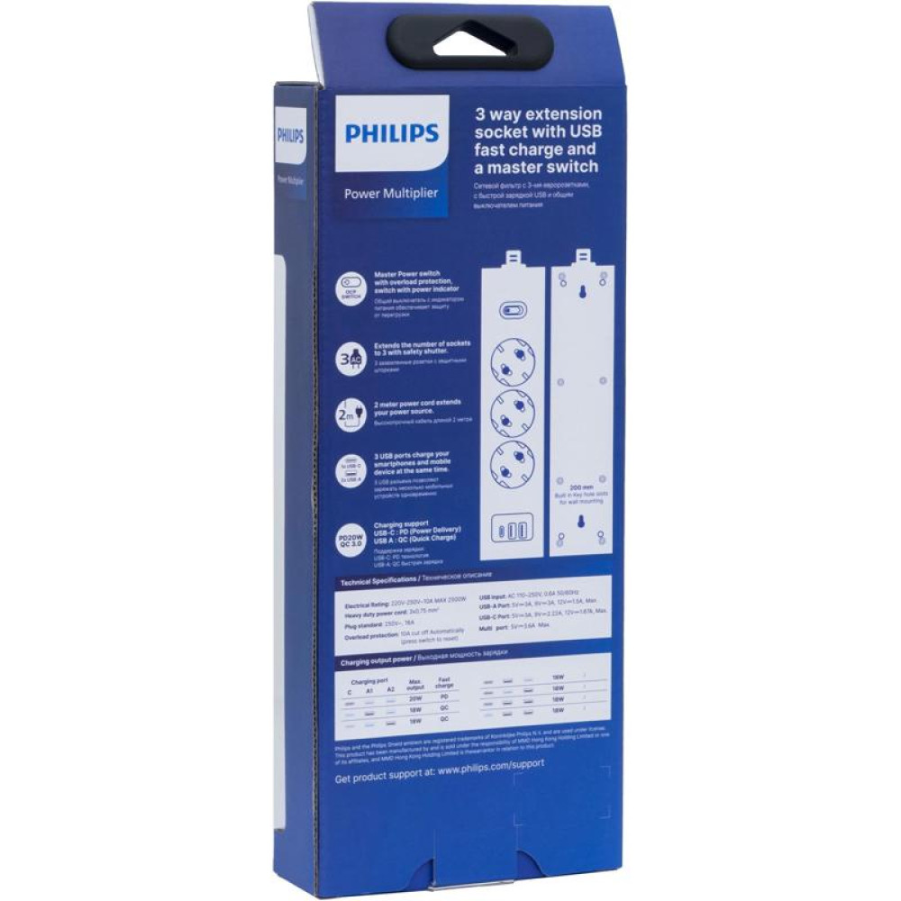 Сетевой фильтр Philips CHP4336BA/51 2м (3 розетки) черный (коробка)