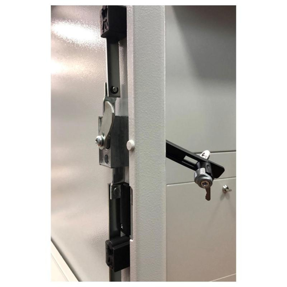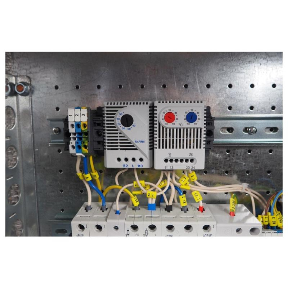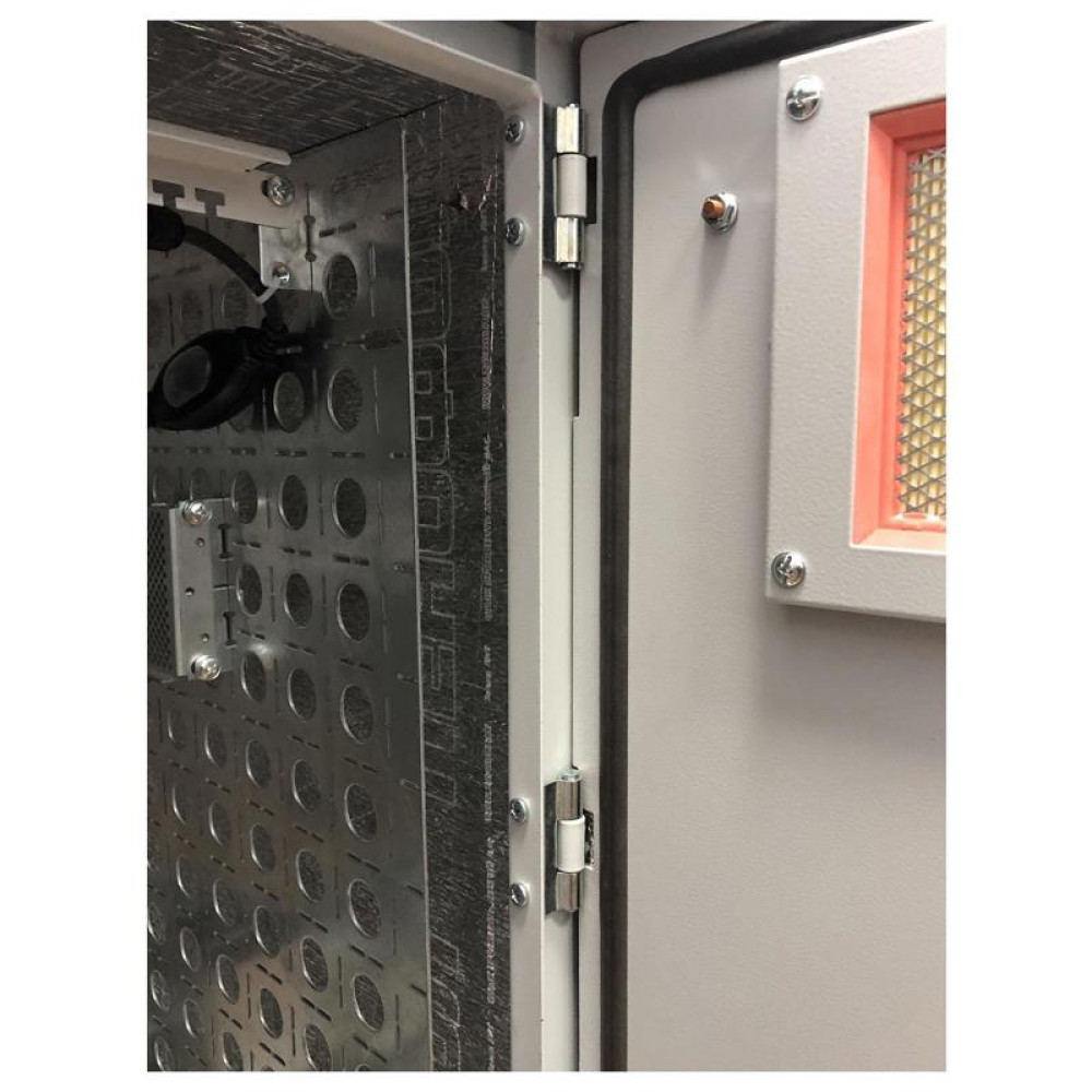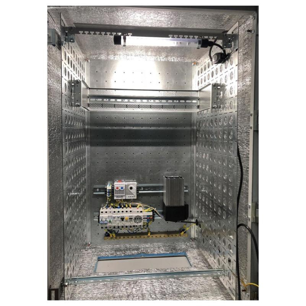 Укомплектованные шкафы серии ШТВ-Н представляют собой готовое решение с системой контроля микроклимата, которая поддерживает заданную температуру и влажность в заданных параметрах круглый год. Комплектация Т1 имеет нагрев и охлаждение. Изделие в климатическом исполнении У1 по ГОСТ 15150–69 предназначено для уличной эксплуатации при температуре от минус 50 до 45 °С и относительной влажности воздуха не более 80 % при 20 °С. Шкаф крепится на стену при помощи четырёх уголков (анкеры не входят в комплект поставки), при необходимости можно применить крепление на столб (не входит в комплект поставки). В основании шкафа предусмотрены съёмные заглушки для ввода кабелей. Конструкция заглушек предполагает разное количество и диаметр отверстий для установки кабельных вводов по желанию заказчика. (В комплект изделия входит один кабельный ввод для подключения питания шкафа). Для крепления на столб необходимо докупить комплект крепления на столб. Питание изделия осуществляется от внешней электрической сети напряжением 220 В переменного тока частотой 50 Гц. Изделие имеет степень защиты от поражения электрическим током класса I по ГОСТ IEC 61140-2012 и соответствует ГОСТ 12.2.027.0-75. Допустимая распределённая статическая нагрузка до 150 кг. Корпус шкафов серии ШТВ-Н имеет металлическую сварную конструкцию, внутри покрыт слоем утеплителя с фольгированным покрытием, что улучшает термоизоляцию и уменьшает теплопотери через стенки шкафа. В комплект шкафа входят задняя оцинкованная панель и комплект вертикальных юнитовых панелей. Двери шкафов серии ШТВ-Н имеют перфорацию, которая обеспечивает вентиляцию установленного в них оборудования, но при этом исключает прямой доступ в полость шкафа и попадание в него инородных предметов. В дверь встроена система вентиляции, состоящая из модуля вентиляторного и фильтра. Максимальный угол открытия двери шкафа 120°. На кронштейне, расположенном на верхней петле двери, находится датчик открытия дверей. Cтепени защиты, обеспечиваемой оболочками от наружного механического удара - IK 10. Перечень установленного оборудования: Вентилятор Нагреватель полупроводниковый Разрядник перенапряжения Индикатор напряжения Гигростат Термостат Выключатель дифференциальный защитный Выключатель автоматический Датчик открытия двери Розетка на DIN-рейку Шина заземления