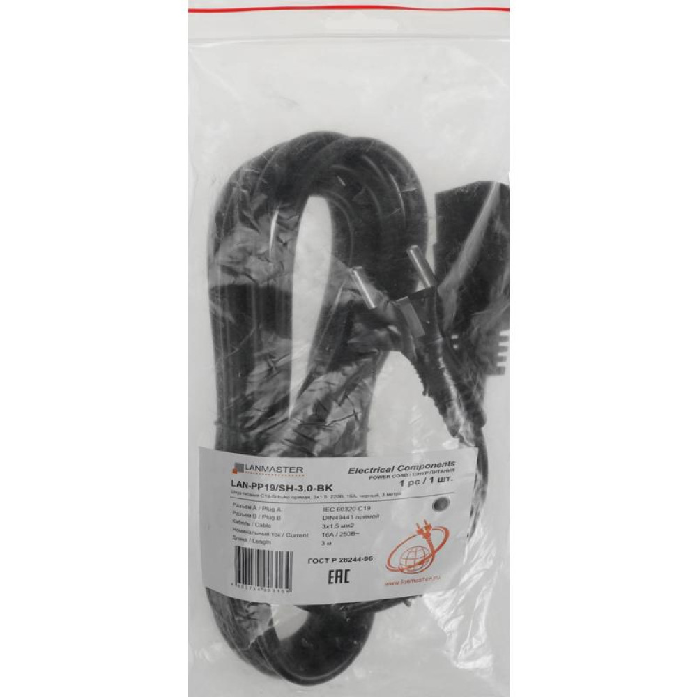 Шнур питания Lanmaster LAN-PP19/SH-3.0-BK C19-Schuko проводник.:3x1.5мм2 3м 220В 16А черный