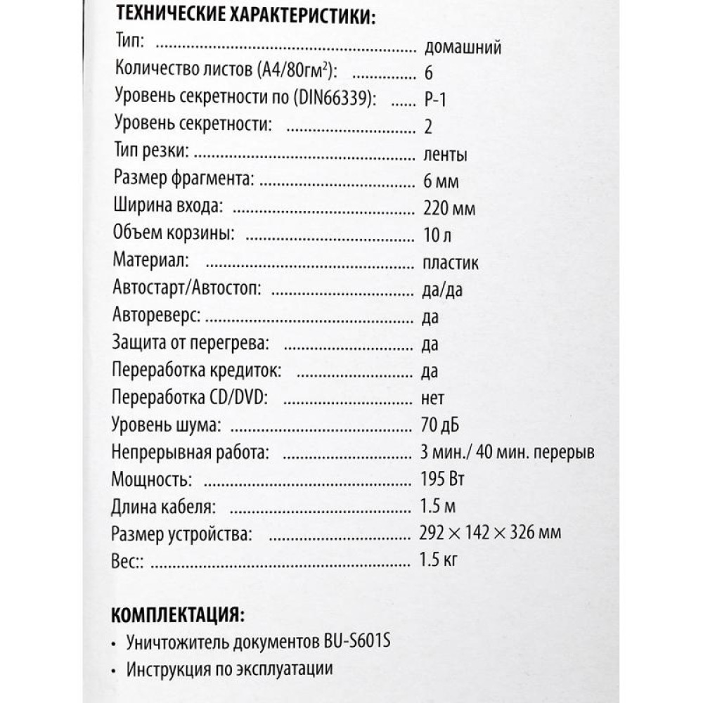 Шредер Buro Home BU-S601S (секр.Р-1) ленты 6 лист. 10 л, пл.карты