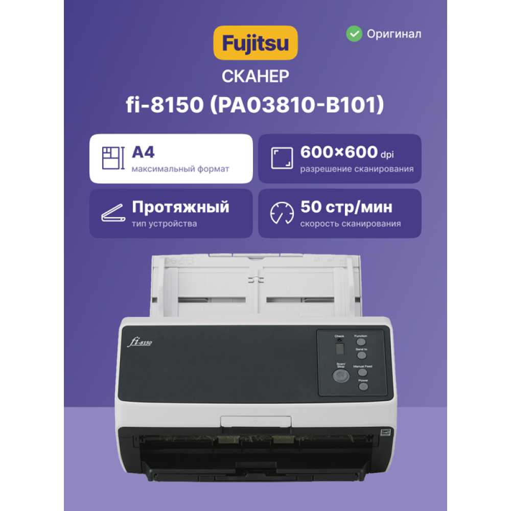 Сканер протяжный Fujitsu fi-8150, CIS, A4, ч/б макс. 50 стр./мин, 600x600 dpi, дуплекс, USB/Ethernet (PA03810-B101)