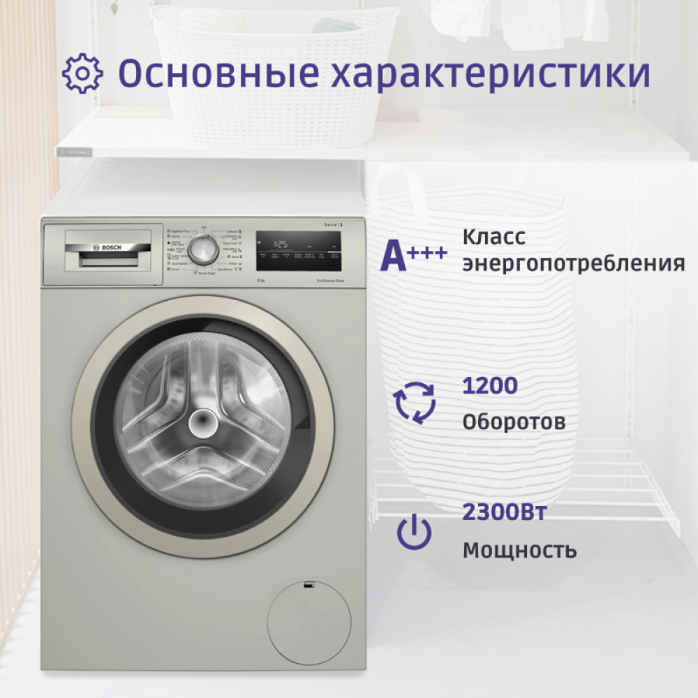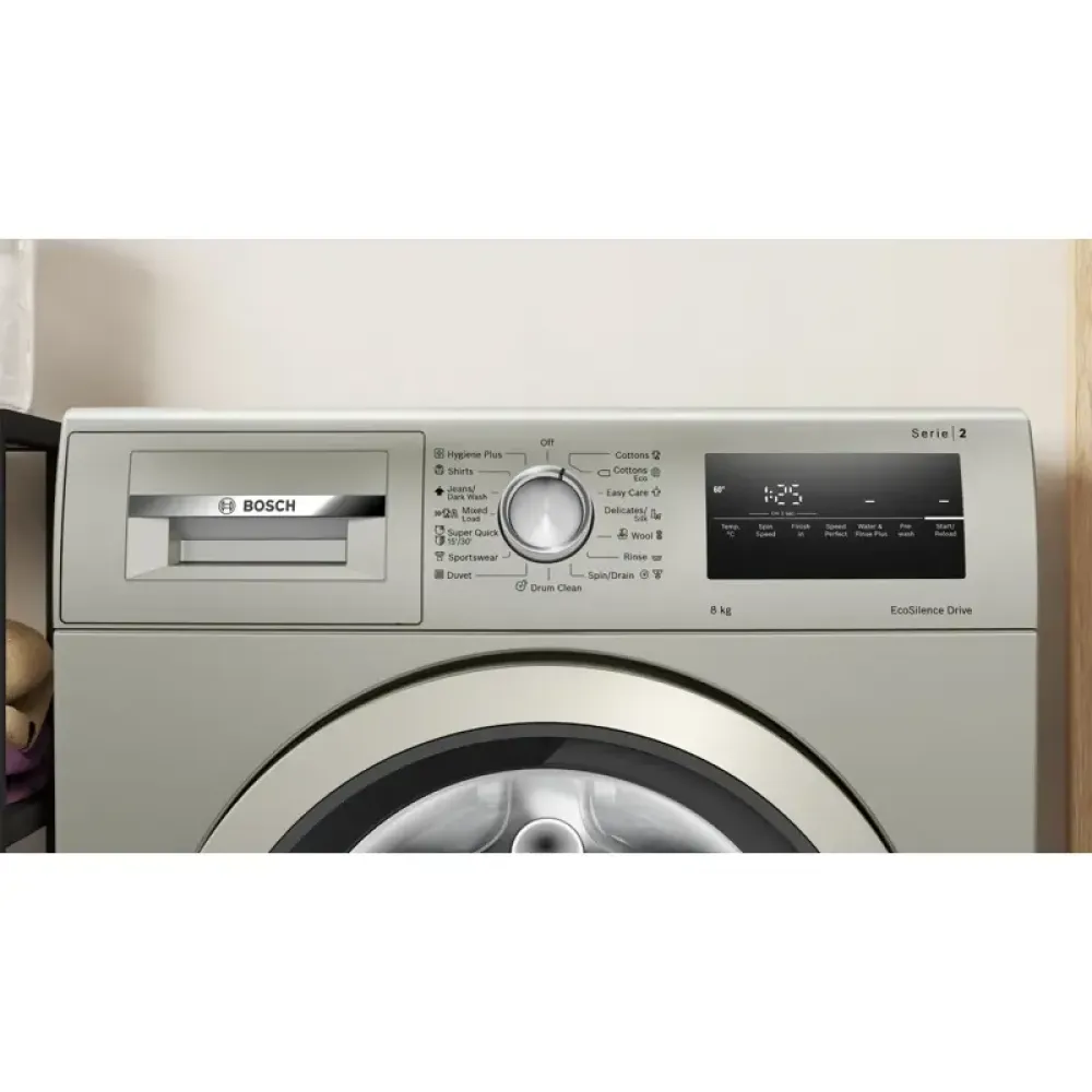 Стиральная машина BOSCH WAN2420XME 84.8x59.8x60, фронтальная загрузка, 8 кг, 1200 об/мин,серый металлик, EcoSilenceDrive, панель управления приборов на английском языке