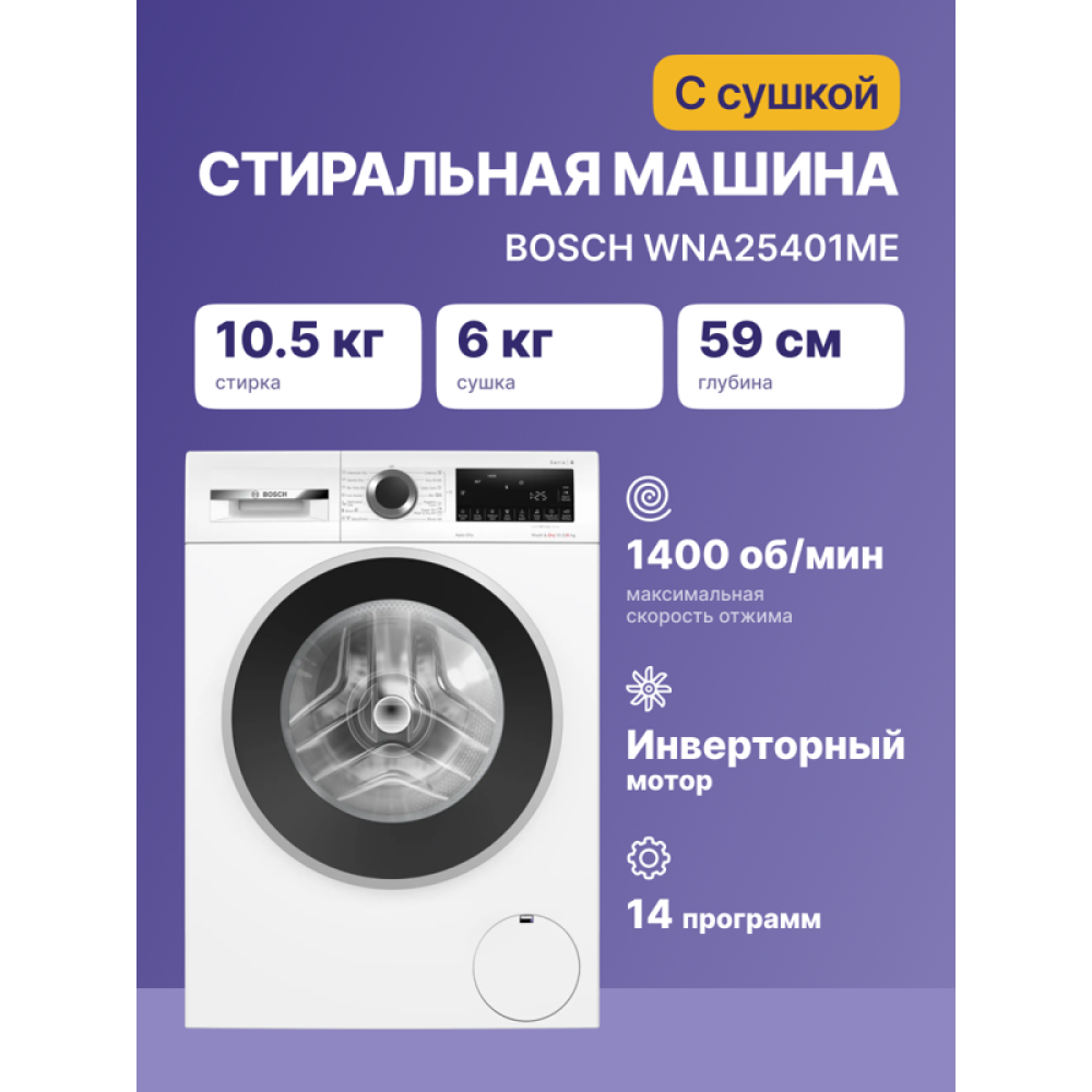 Стиральная машина BOSCH WNA25401ME Стирально-сушильная машина,максимальная загрузка: 10/6 кг, 1400 об/мин, 848x598x590 мм. Класс энергопотребления A, EcoSilence Drive,VarioDrum барабан, многофункциональный LED дисплей,панель управления на английском языке