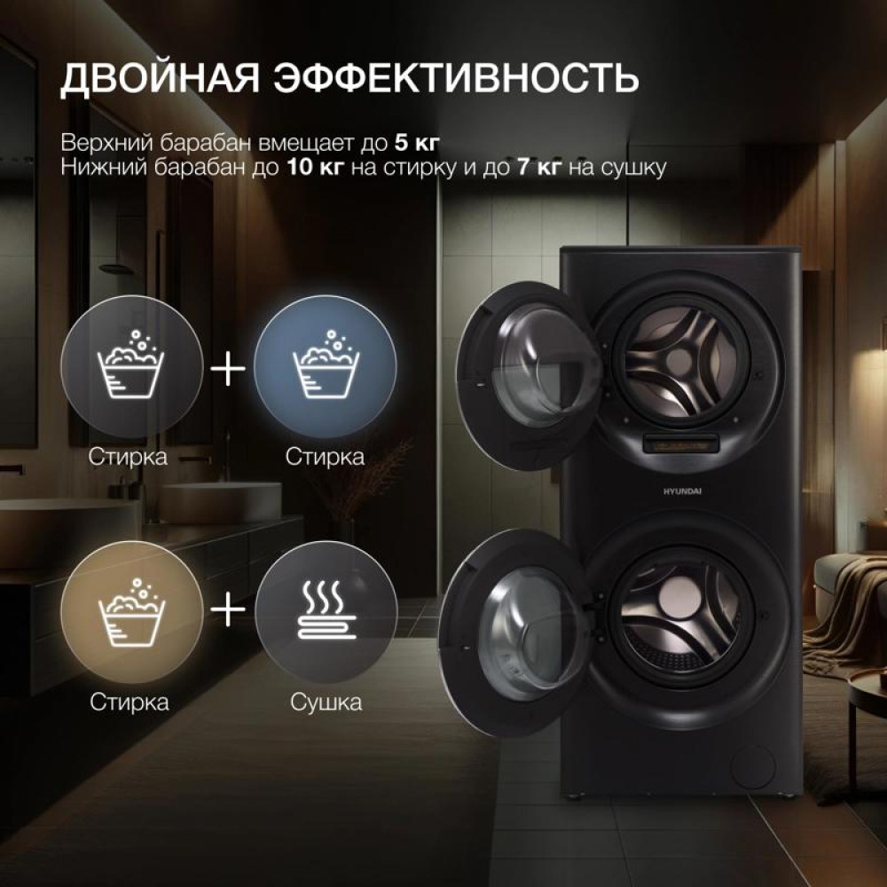 Hyundai Gemini WMD9423 оснащена интеллектуальной сенсорной панелью и дисплеем, а функции, такие как автоматический дозатор моющих средств, освещение барабана, отсрочка старта до 24 часов и защита от протечек, обеспечивают максимальный комфорт и безопасность в использовании. Низкий уровень шума (46 дБ при стирке) позволяет пользоваться машиной даже ночью.