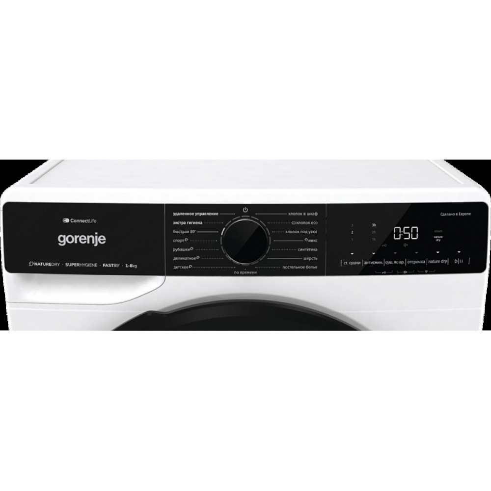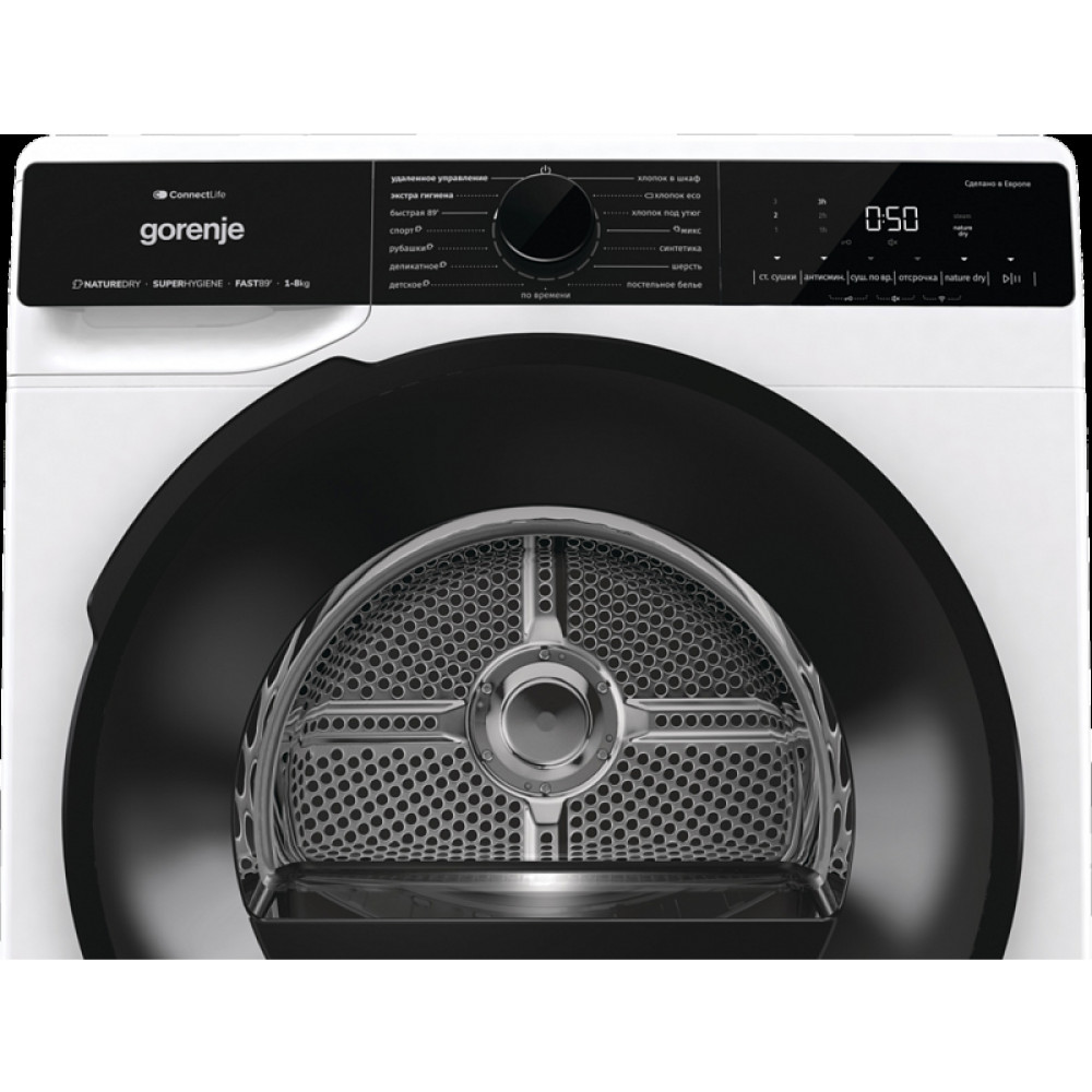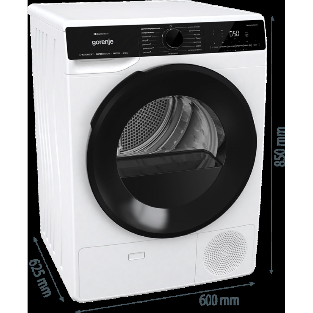 Сушильная машина Gorenje/ Сушильная машина Gorenje, 8 кг, 15 программ, цифровой дисплей с индикацией времени, Wi-Fi управление, подсветка барабана, тепловой насос, сенсор влажности белья, реверсивное вращение барабана, защита от сминания, половинная загру