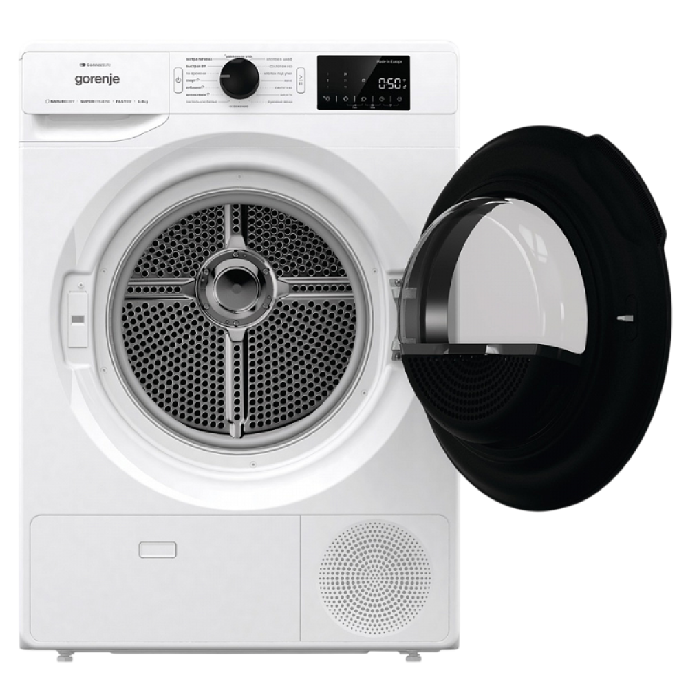 Цифровой дисплей сушильной машины GORENJE DGPNE82GNLW обеспечивает удобное и интуитивно понятное управление. На экране отображается вся необходимая информация о процессе сушки, включая выбранную программу, оставшееся время и другие параметры. Функция Wi-Fi управления позволяет управлять машиной дистанционно через мобильное приложение, что добавляет удобства и гибкости в использовании.