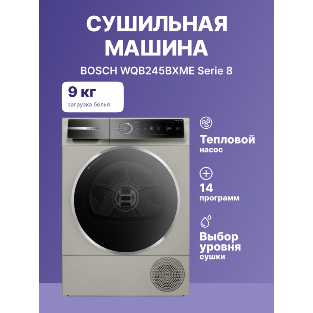 BOSCH WQB245BXME 8 серии — это надежное и эффективное решение для сушки белья. Благодаря современным технологиям, экономичному энергопотреблению и удобному управлению, эта модель станет незаменимым помощником в вашем доме, обеспечивая высокое качество сушки и продлевая срок службы ваших вещей.