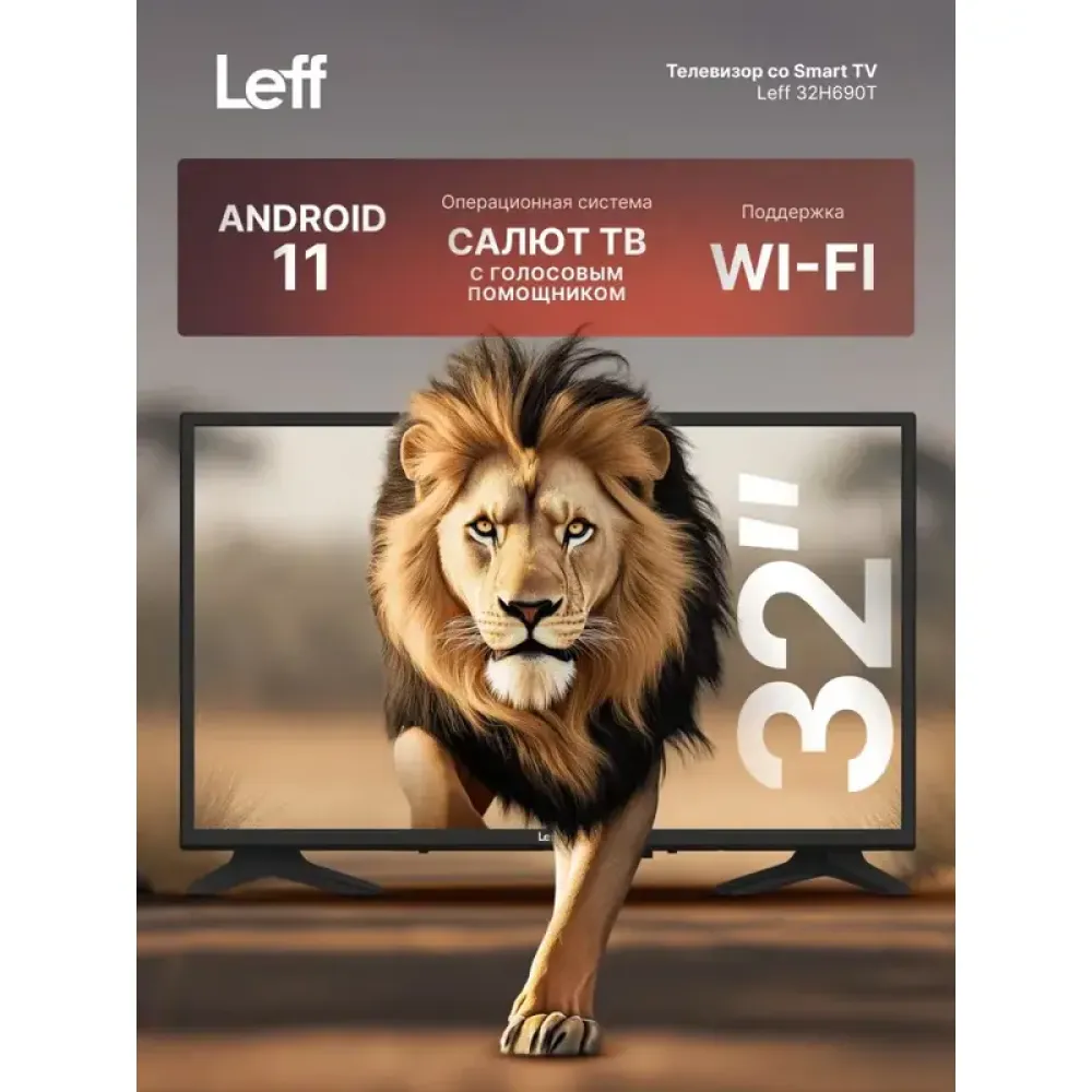Телевизор LED Leff 32H690T (Smart, Салют ТВ)Телевизор LED Leff 32H690T - это идеальное решение для вашего домашнего просмотра. С экраном в 32 дюйма и смарт-функциями он обеспечит невероятное качество изображения и удобство использования. Поддержка платформы Салют ТВ предоставляет доступ к обширной библиотеке контента, включая фильмы, сериалы и приложения, позволяя вам наслаждаться любимыми шоу в любое время.Этот телевизор создан с учетом современных технологий, которые обеспечивают яркие и насыщенные цвета, а также отличную контрастность. Благодаря LED-подсветке вы получите четкое изображение даже при ярком освещении в комнате. Легкость настройки и интуитивно понятный интерфейс смарт-платформы делают его использование простым и приятным.Leff 32H690T подходит для любой комнаты, будь то гостиная, спальня или кухня. Компактные размеры и стильный дизайн позволят ему гармонично вписаться в ваш интерьер. Наличие различных портов для подключения внешних устройств дает возможность использовать телевизор как медиаплеер для проигрывания контента с USB-накопителей или подключения игровых консолей.Обновите ваш телевизионный опыт с Leff 32H690T, который сочетает в себе отличное качество, современные функции и доступ к безграничному количеству развлекательного контента. Этот телевизор подходит как для семейных вечеров за просмотром любимых программ, так и для личных моментов уединения с хорошим фильмом. Не упустите возможность сделать ваш досуг более увлекательным и насыщенным с этим функциональным телевизором.