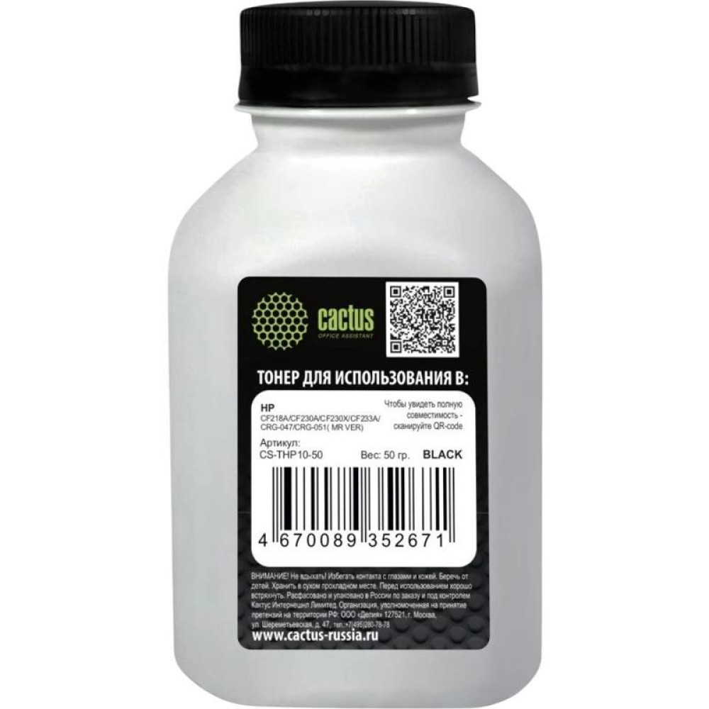 Тонер Cactus CS-THP10-50 черный флакон 50гр. для принтера HP CF218A/CF230A/CF233A/CRG-047/CRG-051( MR VER) M106/134/ M106/134,LJ Pro M104/M132/M203/M227,Canon LBP 112/113/162,MF-112/113/264/267/269