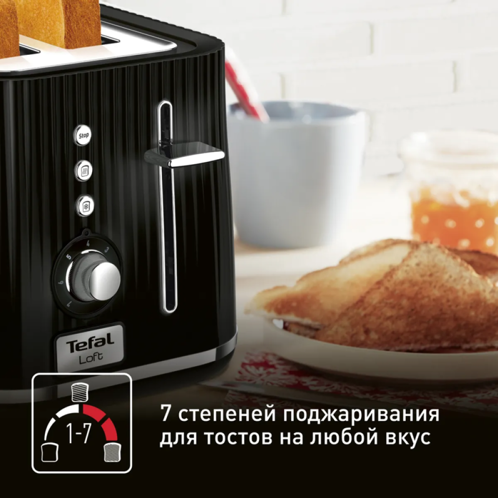 Тостер оснащен 7 уровнями поджаривания, что позволяет настроить желаемую степень прожарки. Доступны дополнительные функции: разморозка, подогрев и стоп-функция, которые расширяют возможности использования прибора.