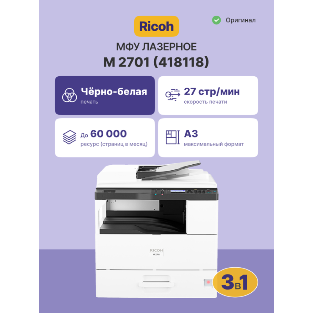 Универсальное и высокопроизводительное многофункциональное устройство формата A3 M 2701 представляет собой надежное комплексное решение для любых потребностей при работе с документами. Оно поддерживает черно-белую печать и копирование со скоростью 27 стр/мин, а также цветное сканирование. Реверсивный АПД позволяет автоматизировать сканирование, кроме того, для упрощения управления предлагается возможность быстрого доступа к расширенным функциям, таким как копирование удостоверений и сканирование в электронную почту. Устройство поддерживает двустороннюю печать, может оснащаться тремя лотками и обеспечивает простую печать на бумаге различного формата, а также подачу конвертов и этикеток.