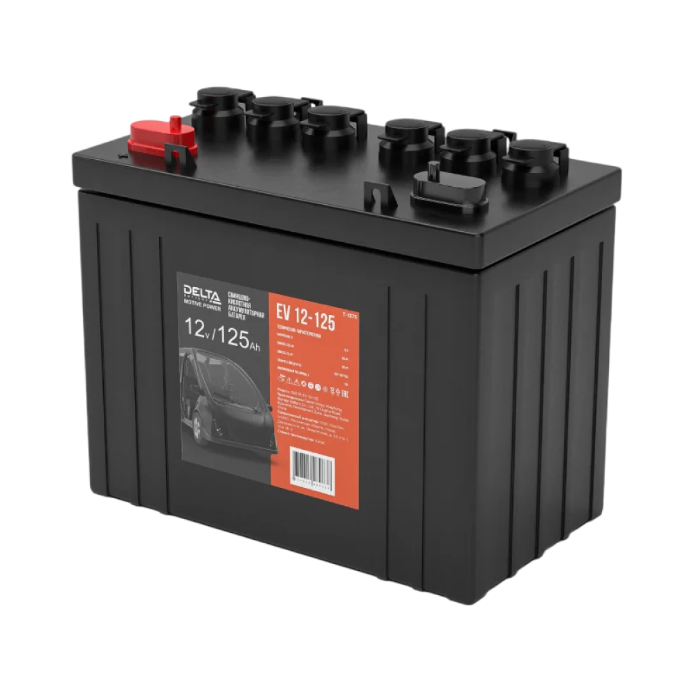 Тяговая аккумуляторная батарея для электротранспорта/ DELTA серия EV, EV 12-125, напряжение 12В, емкость 125 Ач (разряд 5 часов; 1,75В/эл), Максимальный ток заряда 27А, полярность прямая ( + -), тип WET;Pb (свинцово-кислотный), клеммы: болт/конус, ДxШx