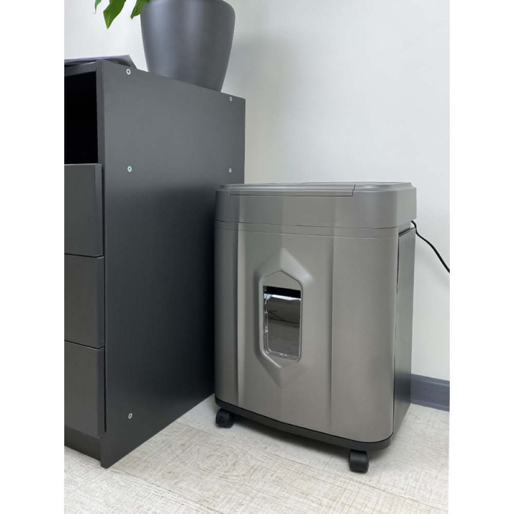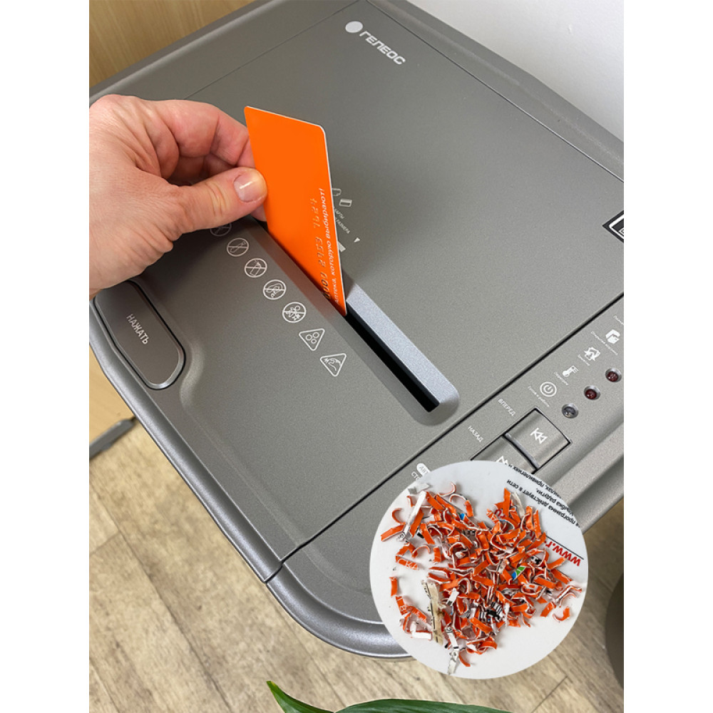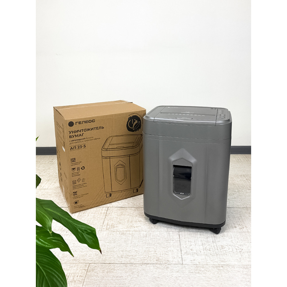 Уничтожитель документов ГЕЛЕОС АП23-5, DIN P-5 (5 ур-нь секр.), фрагмент 1,9х12мм, АВТОПОДАЧА 145 лист (70г/м2), пл.карты/скрепки/скобы, 23 литра