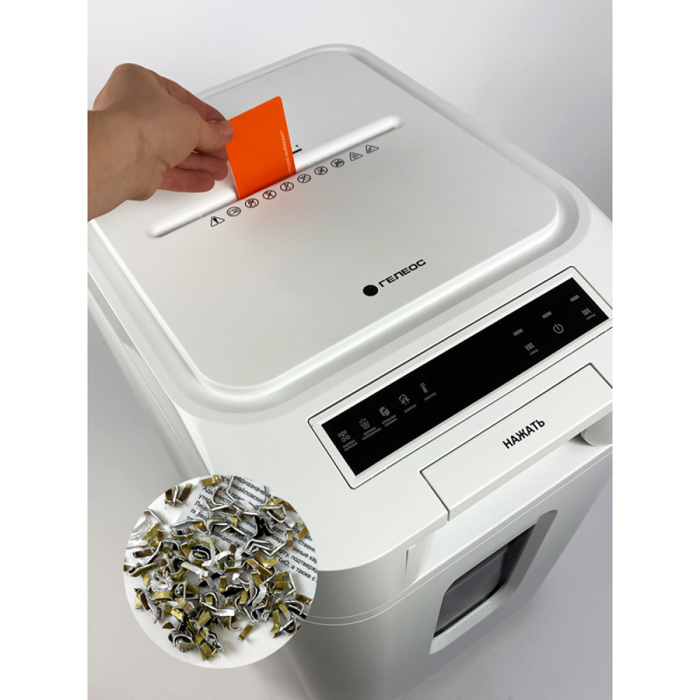 Уничтожитель документов ГЕЛЕОС АП37-5, DIN P-5 (5 ур-нь секр.), фрагмент 1,9х12мм, АВТОПОДАЧА 220 лист (70г/м2), пл.карты/скрепки/скобы, 37 литров