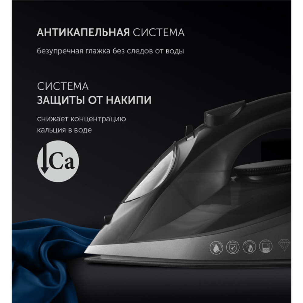 Система защиты от накипи.Функция самоочистки.Шарнирное вращение шнура.Объем резервуара для воды - 270 мл.