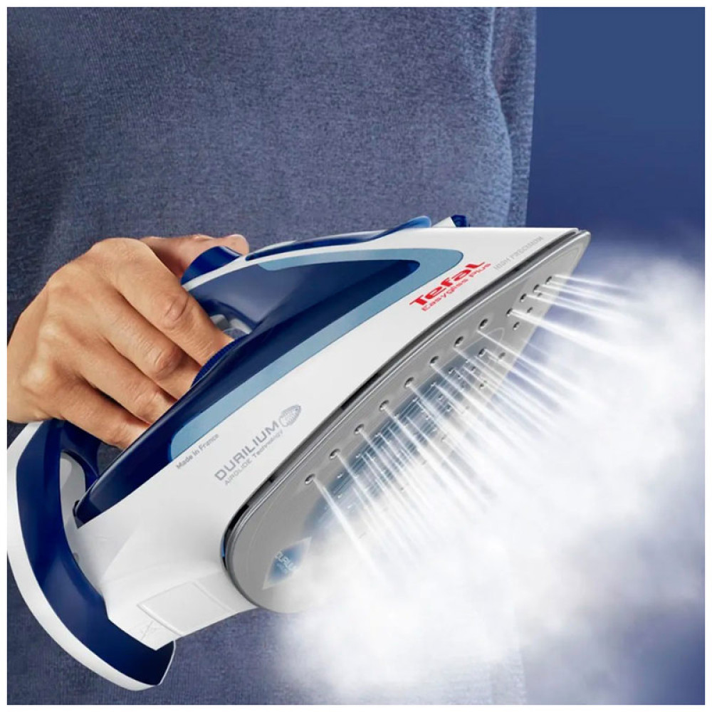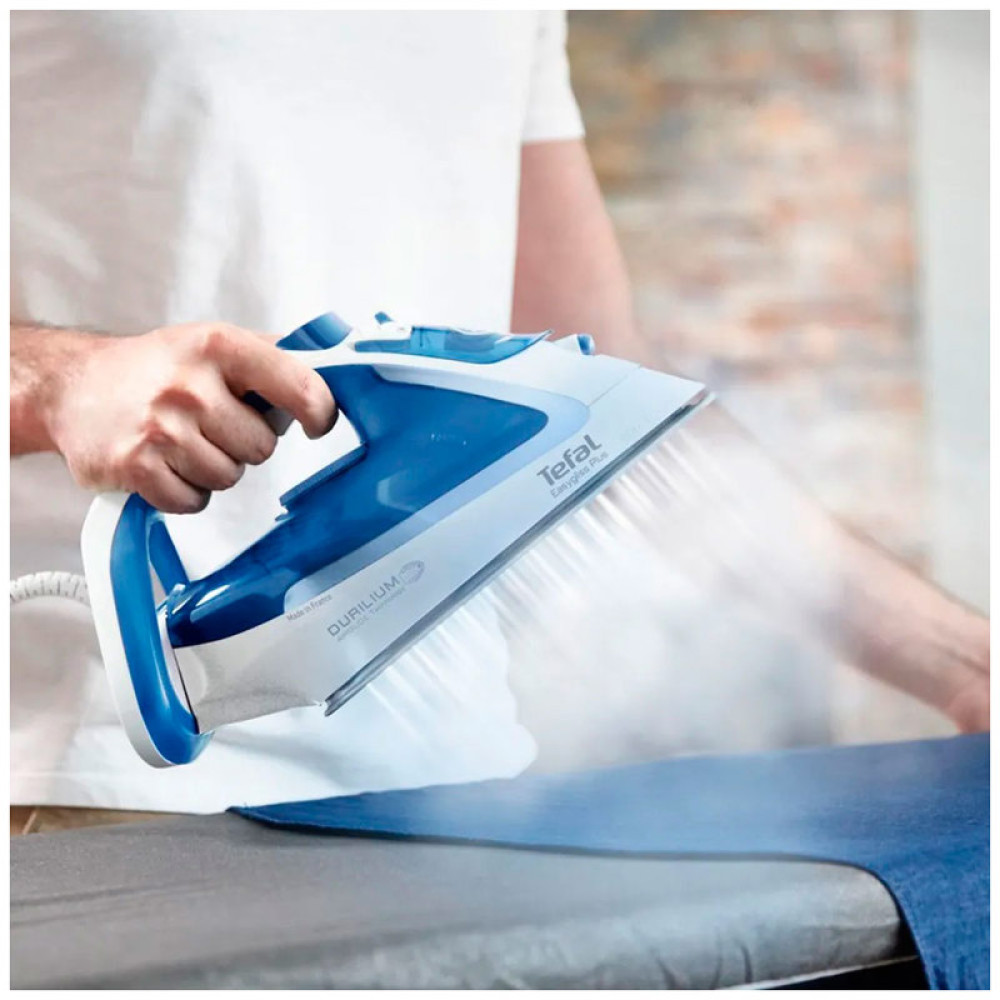 Утюг Tefal Easygliss 2 FV5736E0 мощностью 2,5 кВт выполнен в пластиковом корпусе белого и синего цвета. Мощность подачи пара — 45 г/мин при силе парового удара 220 г/мин. На рабочую поверхность утюга нанесено покрытие из тефлона и керамического сплава для обеспечения более легкого скольжения при глажке. Для подключения к сети питания используется кабель длиной 2 м, для регулировки температуры от 100°С до 190°С есть механический поворотный механизм, емкость резервуара для воды — 270 мл. Размеры утюга — 150х135х300 мм, вес — 1,3 кг.
