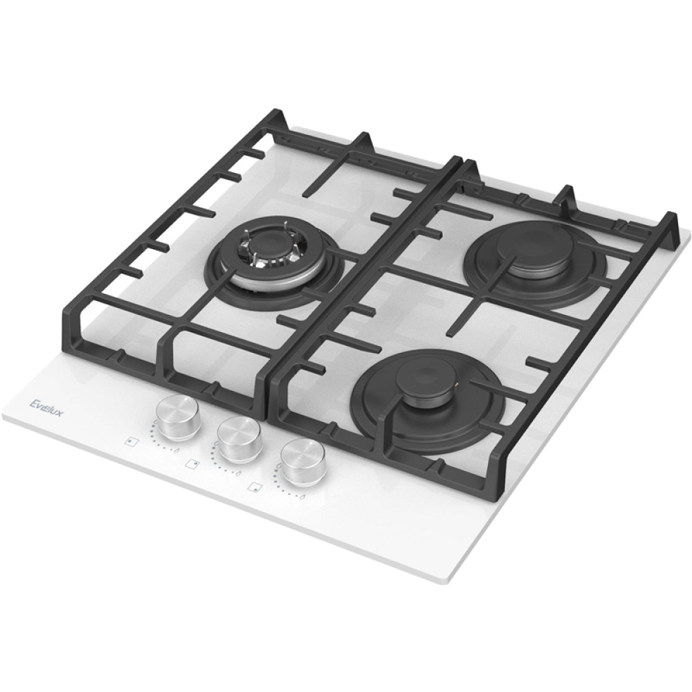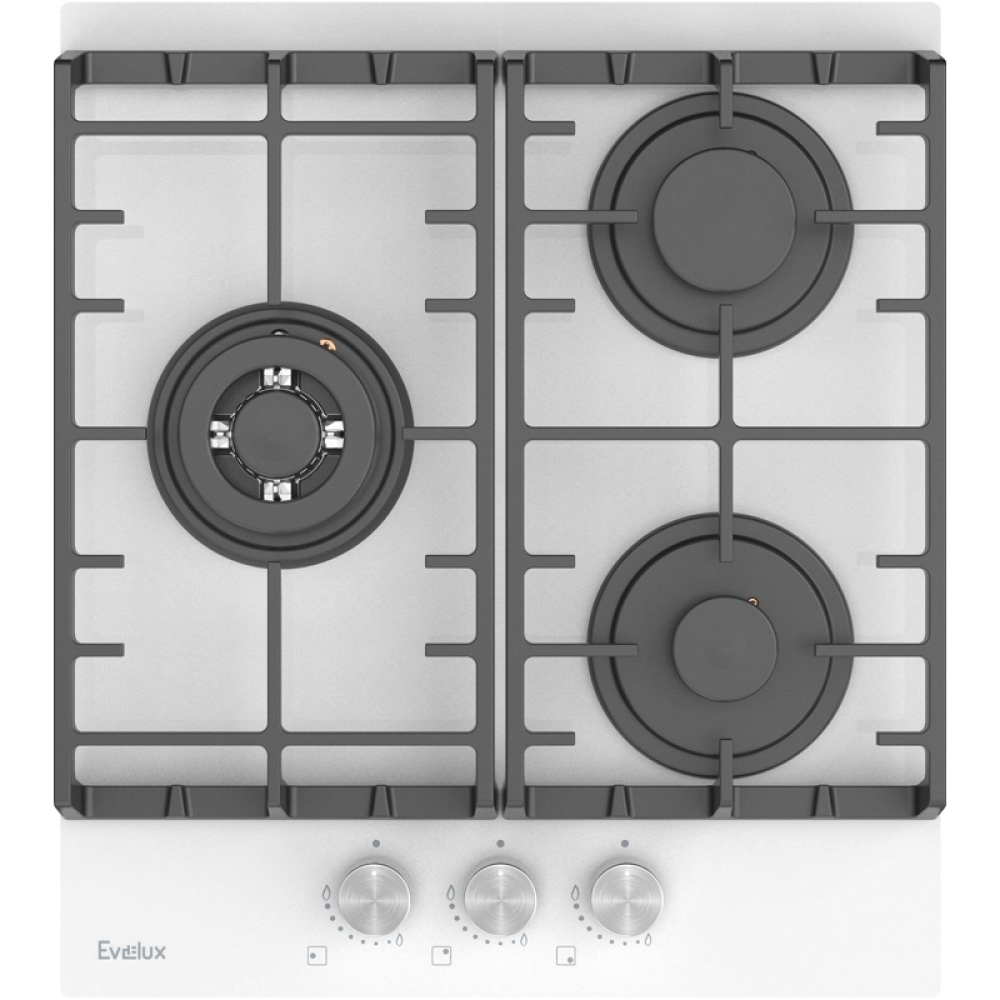 Варочная панель газовая, 45 см, 3 конфорки: экономичная конфорка (0,9 кВт), стандартная конфорка (1,7 кВт), ВОК конфорка (2,5 кВт), газ-контроль, электроподжиг, белое высокопрочное закаленное стекло, чугунные решетки, поворотные переключатели, комплект ф