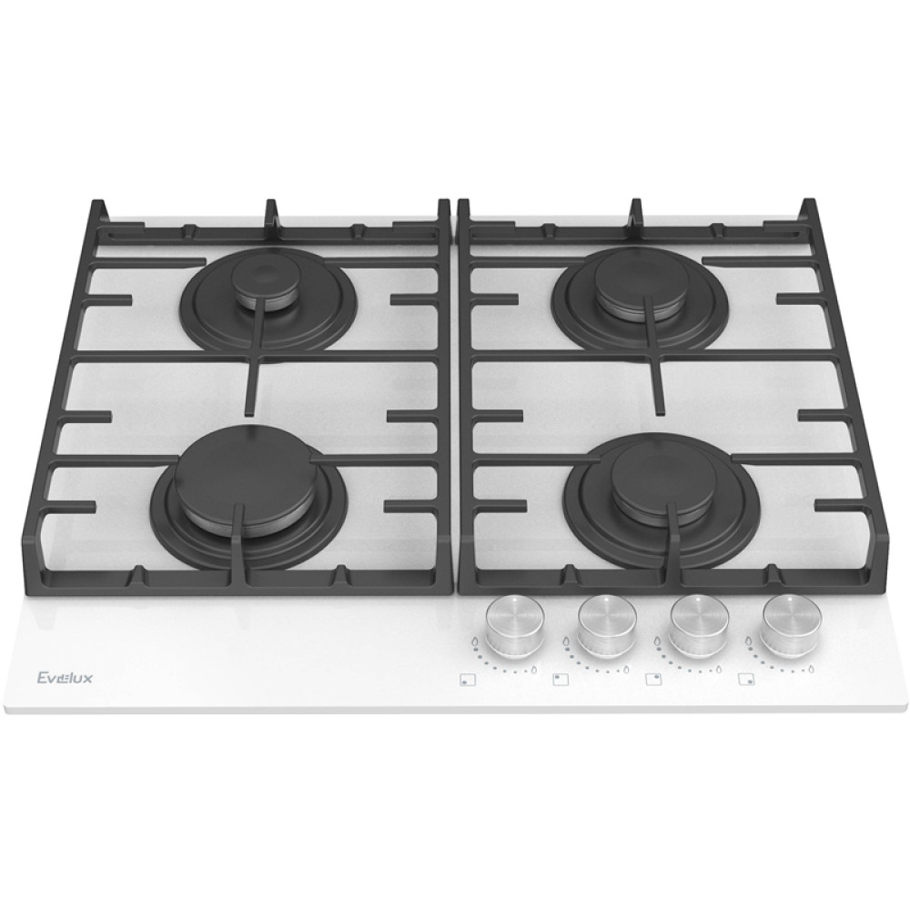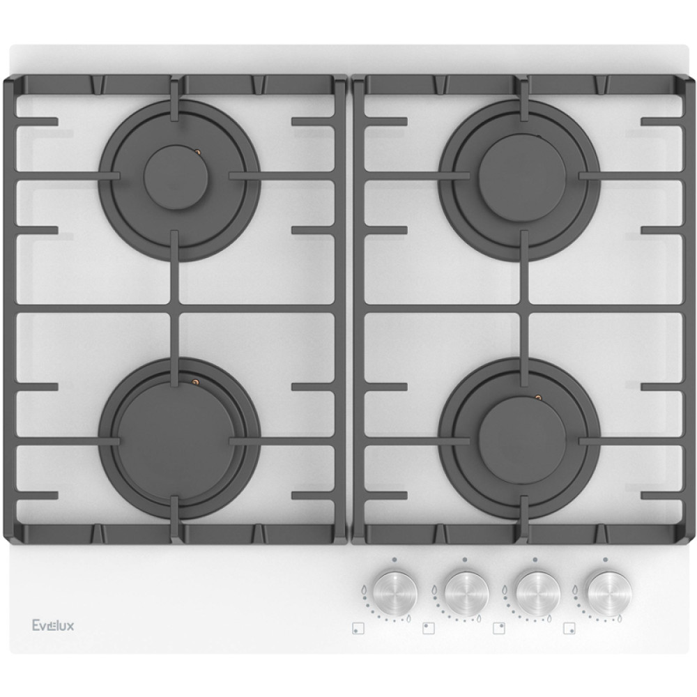 Варочная панель газовая, 60 см, 4 конфорки: экономичная конфорка (0,9 кВт), 2 стандартных конфорки (2х1,7 кВт), экспресс-конфорка (2,9 кВт), газ-контроль, электроподжиг, белое высокопрочное закаленное стекло, чугунные решетки, поворотные переключатели, ко