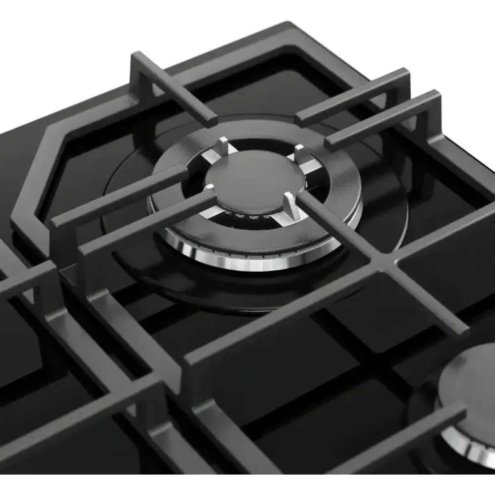Панель включает одну конфорку типа WOK, которая обеспечивает интенсивный нагрев и идеально подходит для быстрого приготовления в глубокой посуде. Стеклянная поверхность из закалённого стекла придает модели современный вид и облегчает уход — достаточно протереть влажной тряпкой. Чугунные решетки прочные и устойчивы, выдерживают тяжелую посуду.