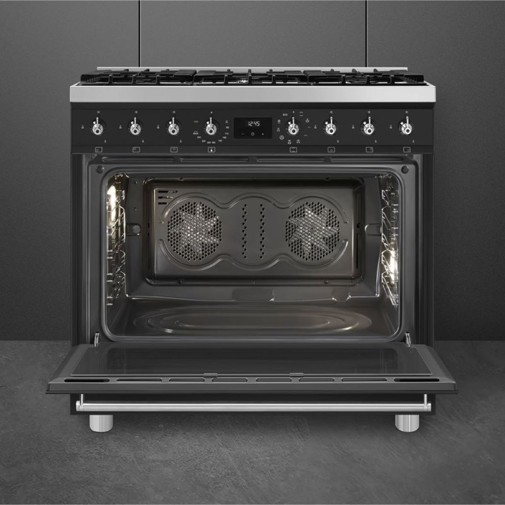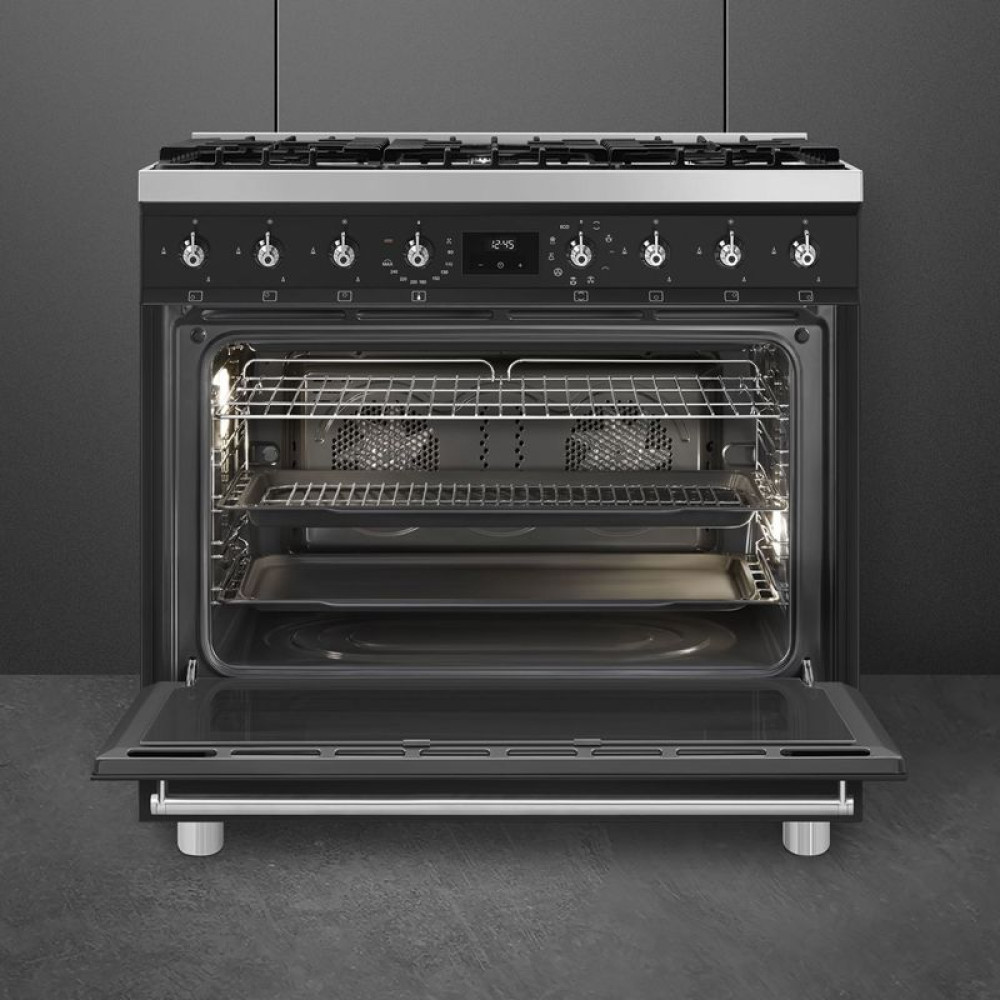 Духовка варочного центра Smeg C9GMMB2 имеет объем 115 литров, что позволяет готовить большие порции еды одновременно. Это идеально подходит для семейных обедов или приема гостей, когда необходимо приготовить много блюд за один раз.