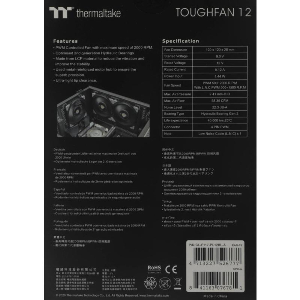 Вентилятор для корпуса Thermaltake Toughfan 12 120х120x25 черный 4-pin 22.3дБ (CL-F117-PL12BL-A) Ret [CL-F117-PL12BL-A]