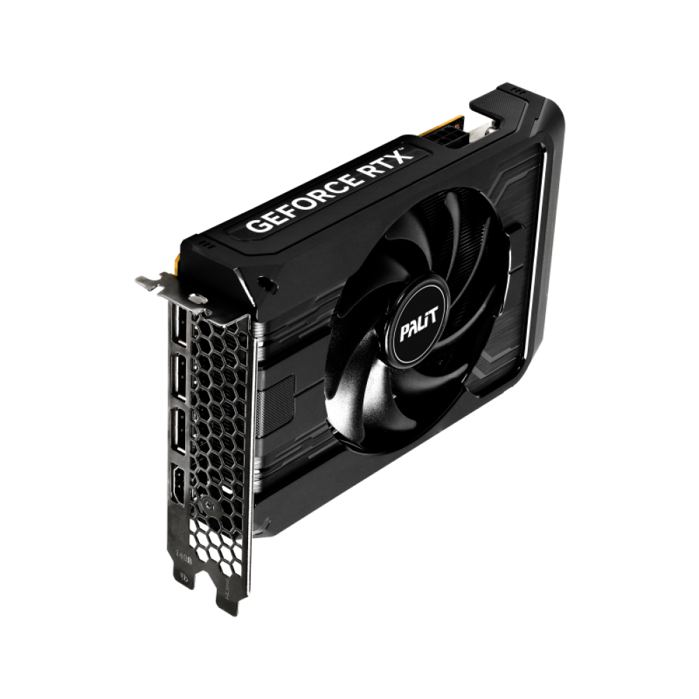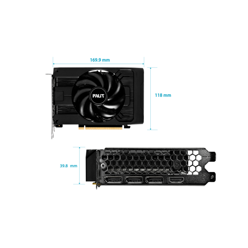 Мощность видеокарты составляет 130 Вт, а рекомендуемая мощность блока питания — 550 Вт. Видеокарта оснащена эффективной системой охлаждения STORMX, которая обеспечивает стабильную работу даже при высоких нагрузках. Компактные размеры (169,9 х 118 х 39,8 мм) и высота в 2 слота позволяют легко интегрировать её в большинство современных корпусов, включая компактные сборки.