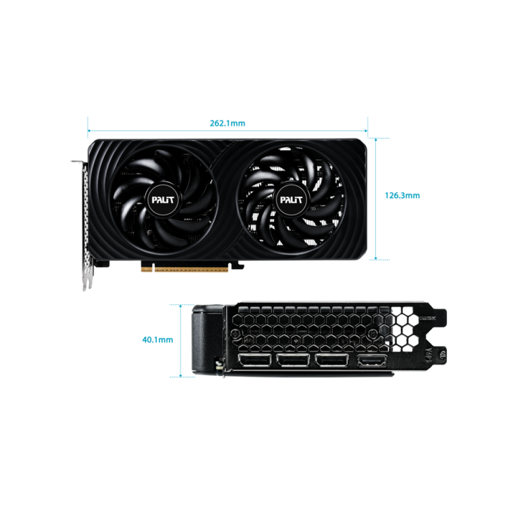 С мощностью 180 Вт видеокарта требует блока питания мощностью 600 Вт, что делает её совместимой с большинством современных систем. Дополнительное питание осуществляется через 8-контактный разъём, а двухслотовый дизайн и компактные габариты 262,1 х 126,3 х 40,1 мм облегчают установку даже в ограниченном пространстве. Эффективная система охлаждения Dual обеспечивает стабильную работу и низкий уровень шума, что особенно важно для длительных игровых сессий или профессиональной работы.