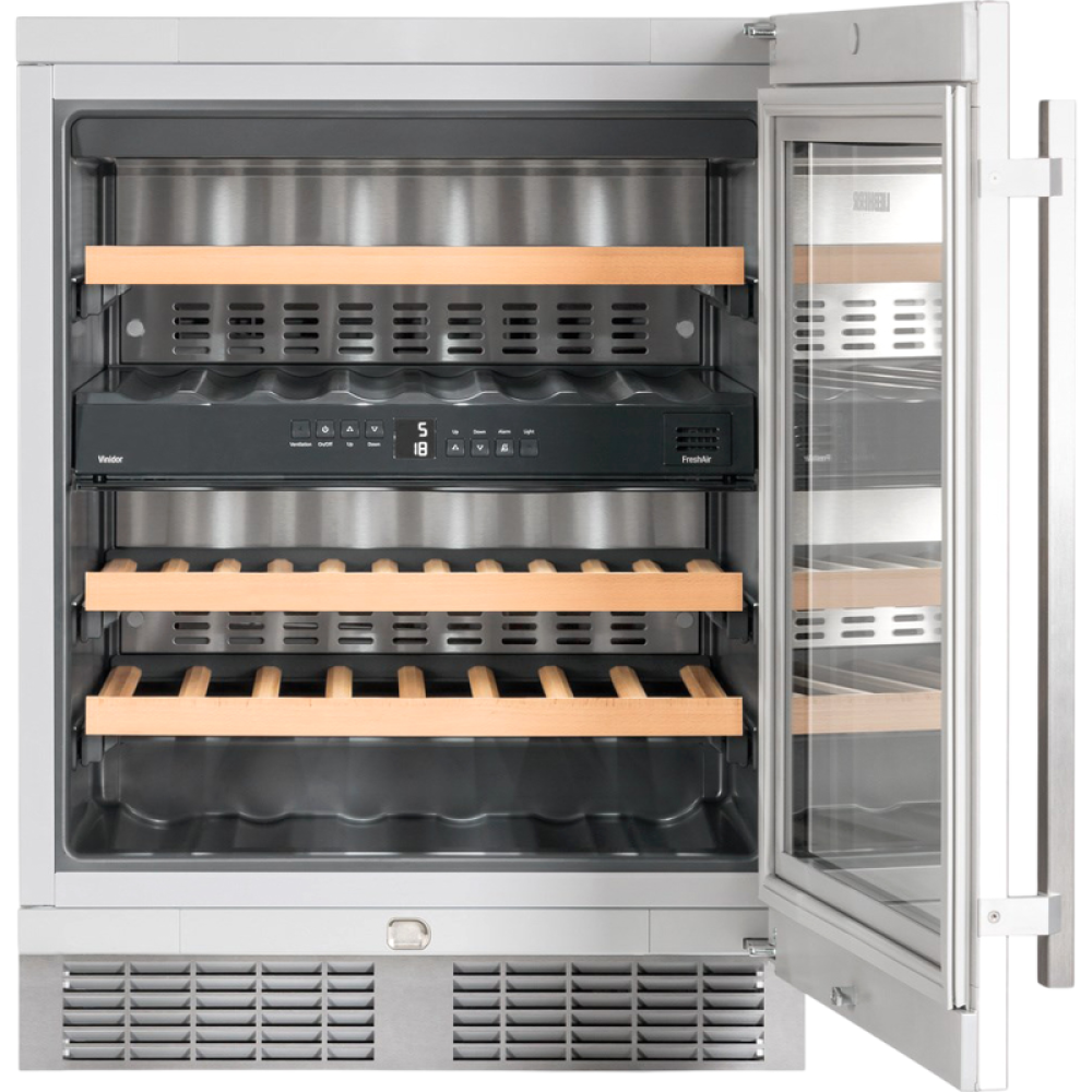 Дверь шкафа оборудована автоматическим доводчиком SoftSystem, который обеспечивает плавное и бесшумное закрывание. Это удобно в использовании и помогает сохранить целостность бутылок, предотвращая резкие удары.