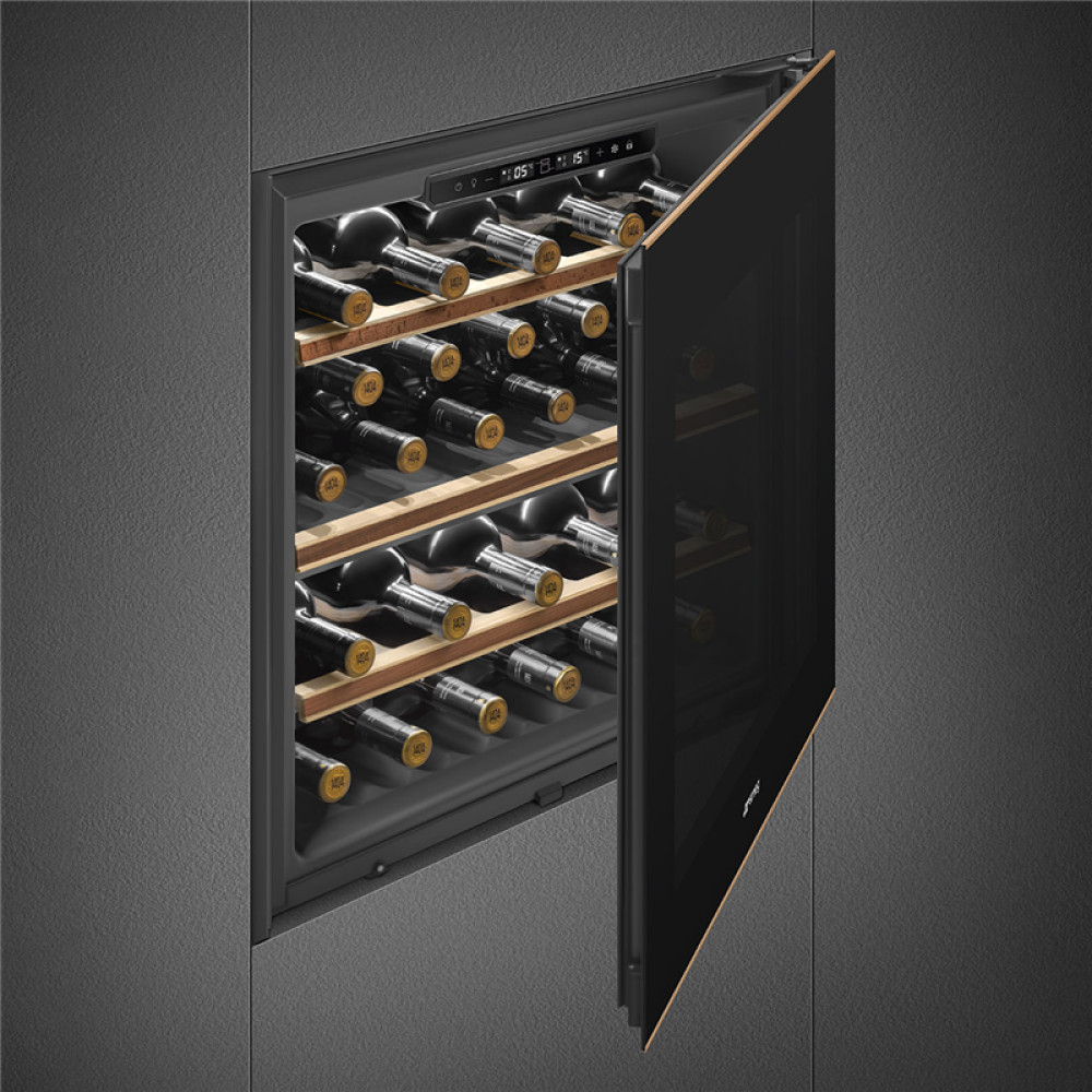 Винные шкафы SMEG/ Холодильный шкаф для вина встраиваемый, 60 см, высота 60 см, петли перенавешиваемые, черное стекло.