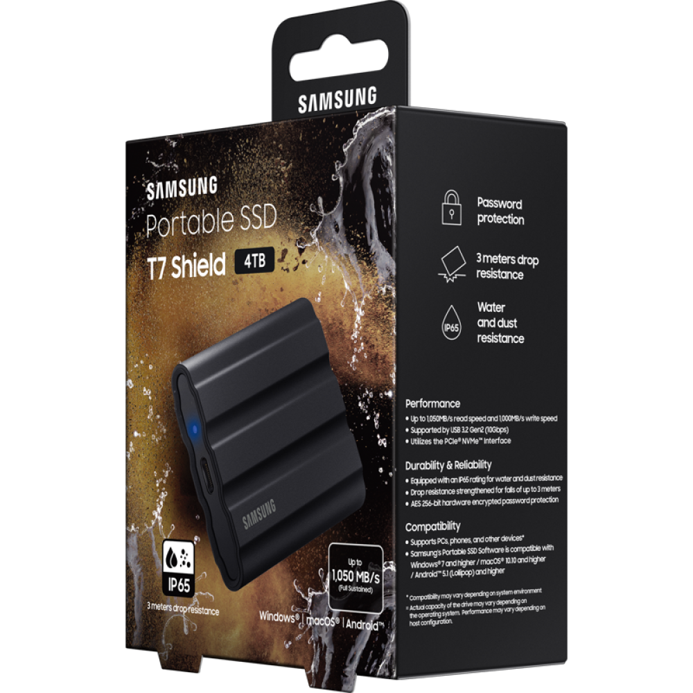 Внешний SSD Samsung T7 Shield выполнен в черном корпусе с рельефной прорезиненной поверхностью, что не позволяет ему скользить по гладким поверхностям. Металлический корпус защищен от влаги, от пыли, от ударов в соответствии с IP65, что делает устройство идеальным вариантом для повседневного пользования. Компактные размеры и надежное исполнение корпуса позволяет повсюду брать диск с собой.