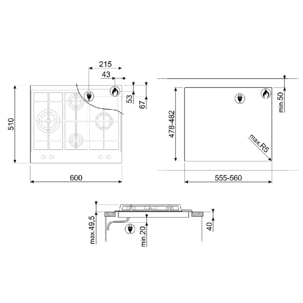 Встраиваемая газовая панель SMEG/ Газ, Linea,газовая варочная панель, 60 см,нержавеющая сталь