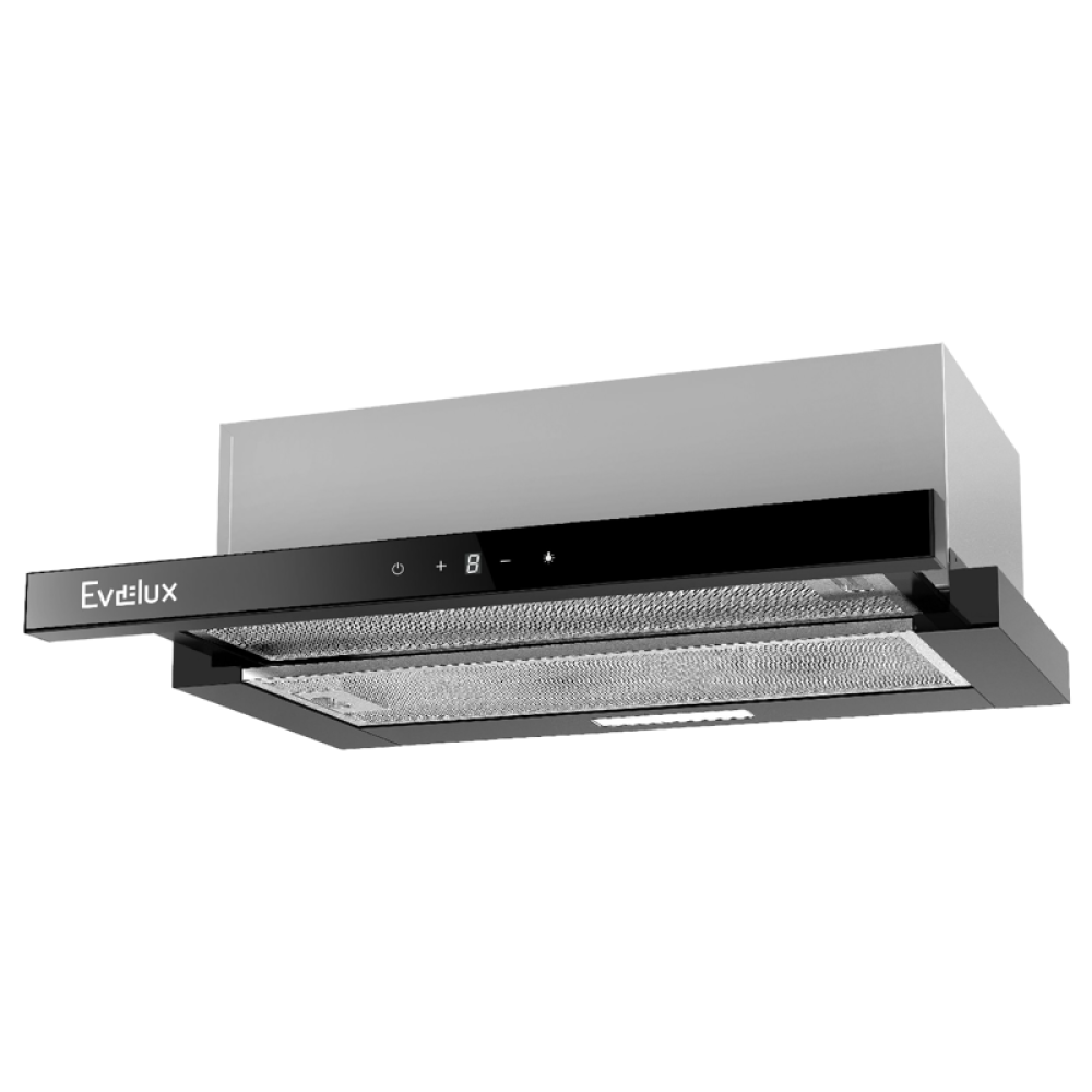 Встраиваемая вытяжка EVELUX, телескопическая, High-Tech, 60 см, 3 скорости, макс. Производительность 750 м3/ч, обратный клапан, LED подсветка, сенсорное управление, угольный фильтр ECFA 2123 (опция), цвет черный