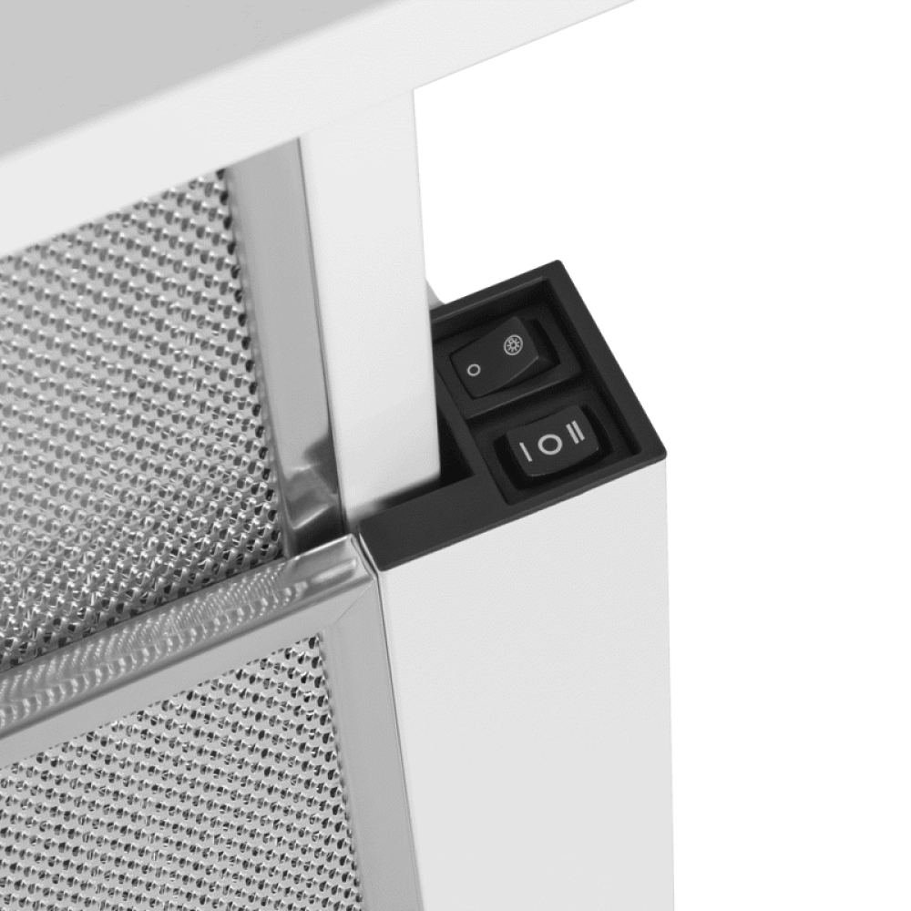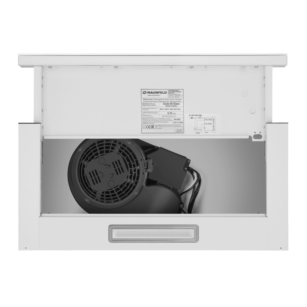 Встраиваемая вытяжка MAUNFELD/ Встраиваемая вытяжка MAUNFELD Clyde 50 Glass White Тип: телескопическая Цвет: белый Управление: колыбельное Ширина, мм: 500 Полная потребляемая мощность, Вт: 100 Количество скоростей: 2 Максимальная производительность, м3/ч: