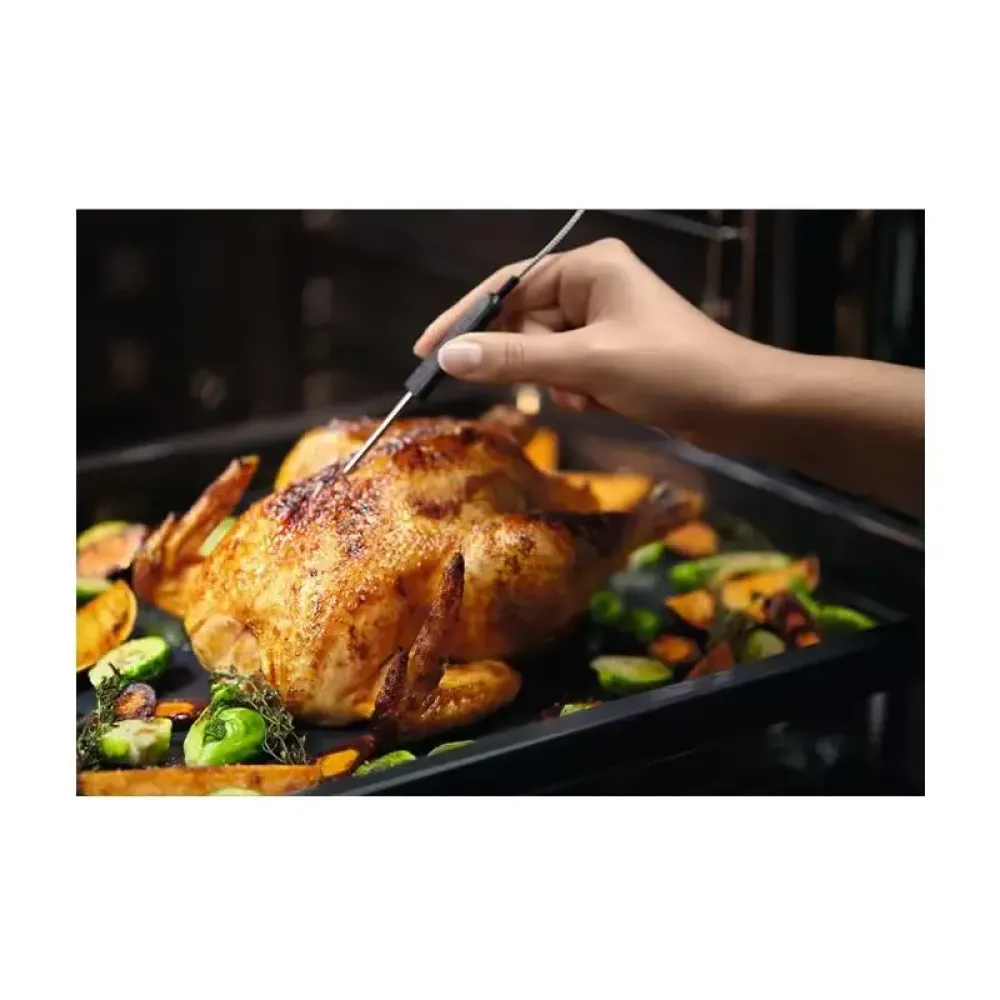 Пиролитическая очистка облегчает процесс ухода за духовкой, поддерживая ее в чистоте без использования агрессивных химических средств. Пиролитическая очистка позволяет очищать духовку при очень высоких температурах, превращая загрязнения в пепел, который затем легко удаляется. Дверца с тремя стеклами обеспечивает отличную теплоизоляцию и безопасность. Проволочные и телескопические направляющие на одном уровне облегчают доступ к блюдам, позволяя легко выдвигать противни даже с тяжелыми блюдами. Термощуп позволяет точно контролировать температуру внутри блюда, обеспечивая идеальное приготовление и предотвращая пересушивание или недоготовку.