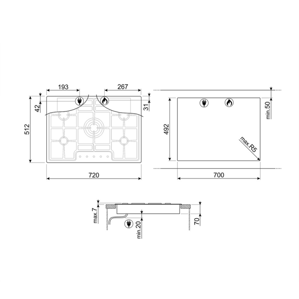 Встраиваемые газовые панели SMEG/ Газ, Газовая варочная панель, 72 см,нержавеющая сталь/ фурнитура Linea и Classica в комплекте