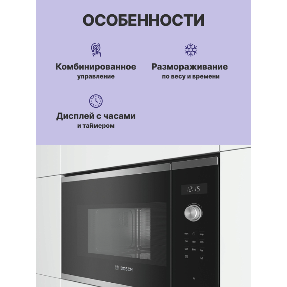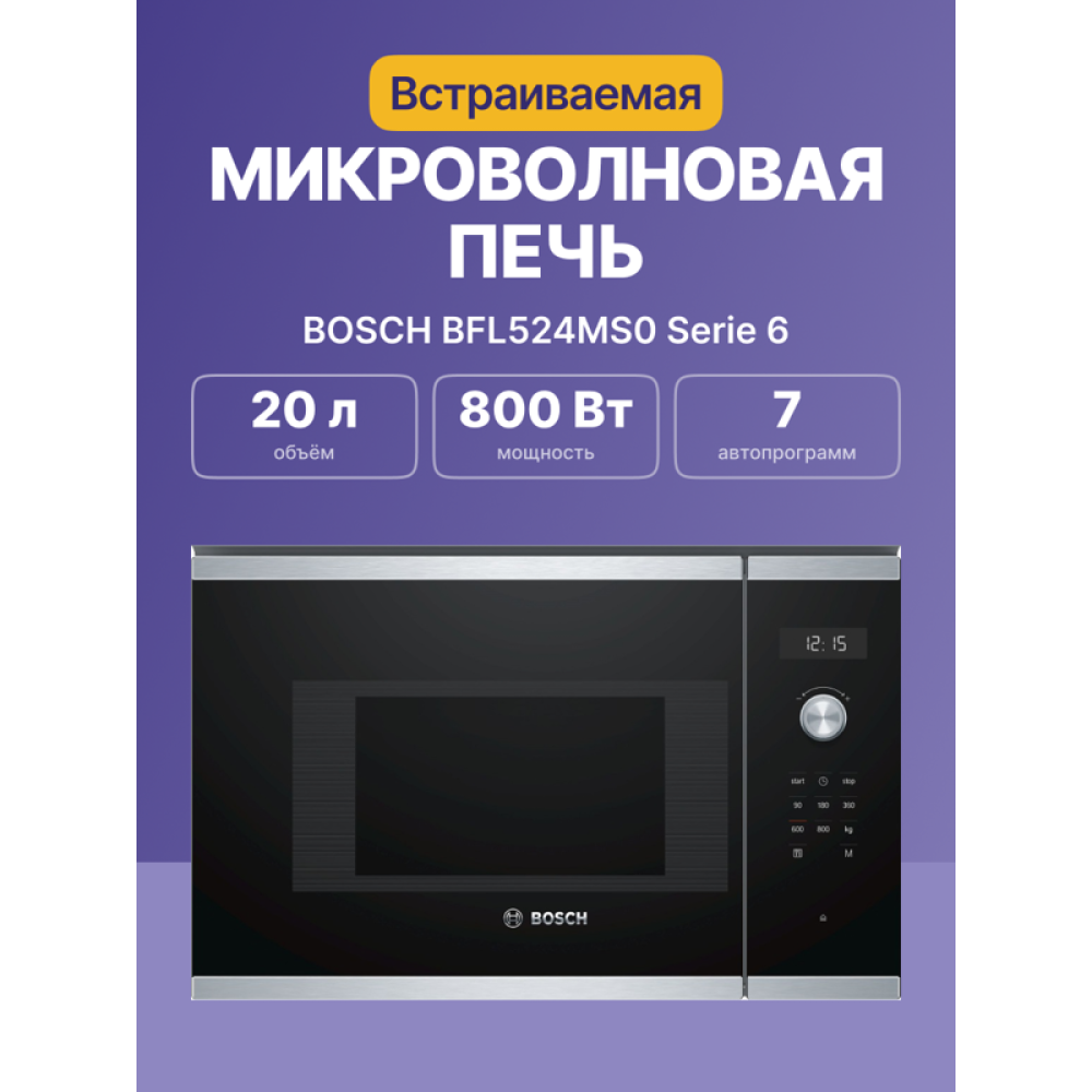 Встраиваемые микроволновые печи BOSCH/ Встраиваемые микроволновые печи BOSCH BFL524MS0 Serie 6, Встраиваемая микроволновая печь, нержавеющая сталь, LED-дисплей, микроволны до 800 Вт, 5 ступеней мощности микроволн, утапливаемый переключатель, 7 автоматичес