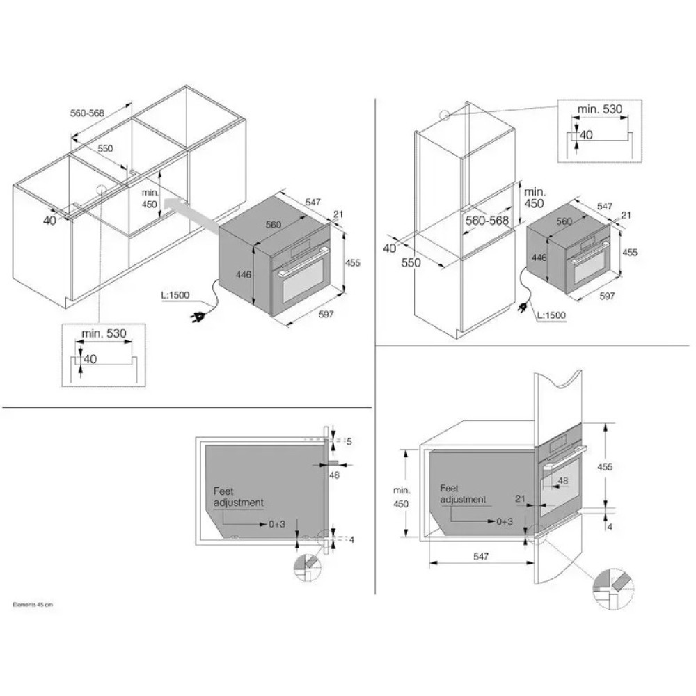 Духовка имеет размеры 45.5×59.7×56.8 см, что позволяет удобно разместить его даже на небольшой кухне. Размеры ниши для встраивания составляют 45×56-56.8×55 см. Внешний вид прибора выполнен в стильном жемчужно-сером цвете, что придаст вашей кухне современный и стильный вид.